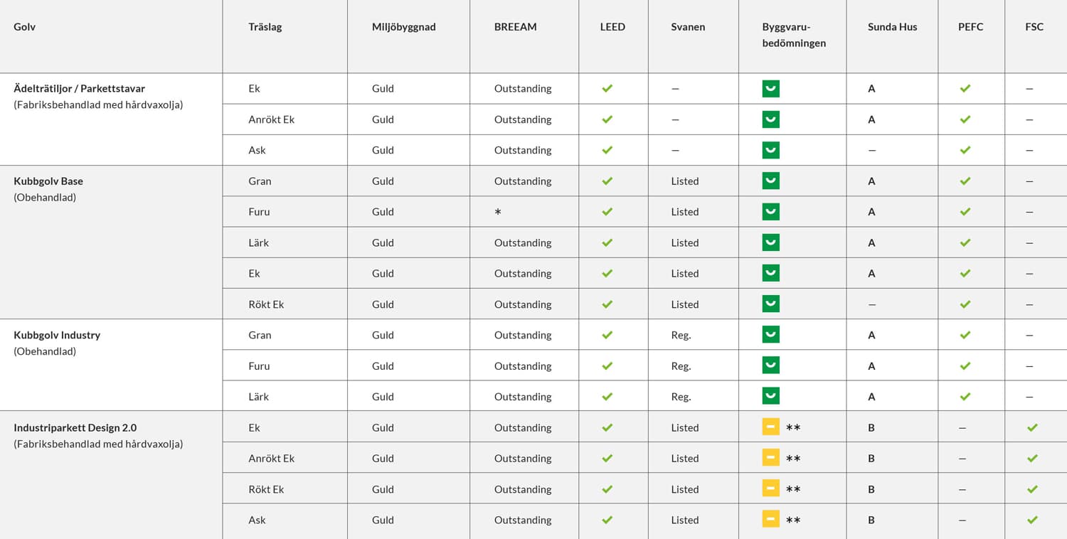 Här hittar du en översikt över bedömningarna av golven i Byggvarubedömningen och SundaHus samt information om hur golven möter krav i BREEAM, LEED, Miljöbyggnad och Svanen.