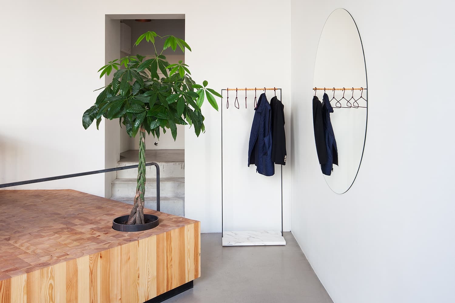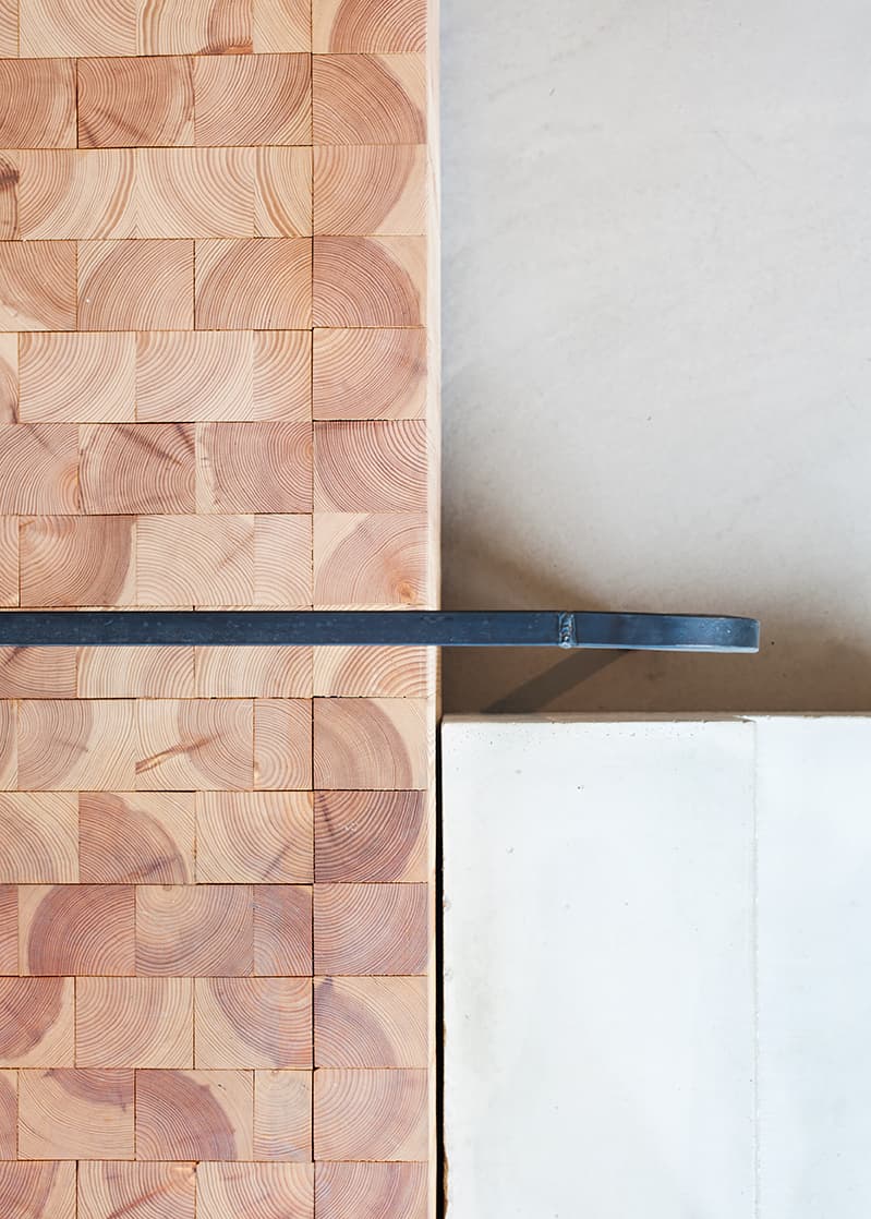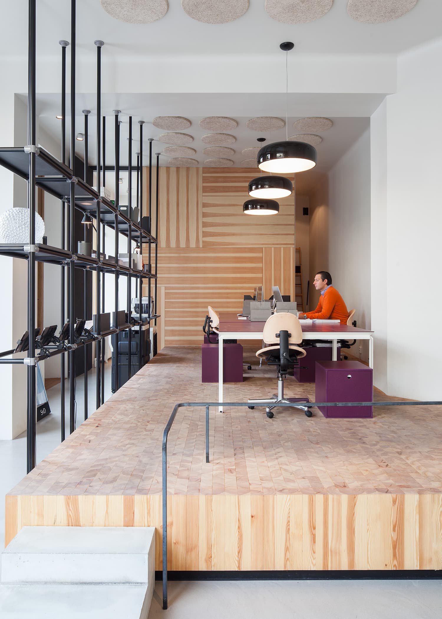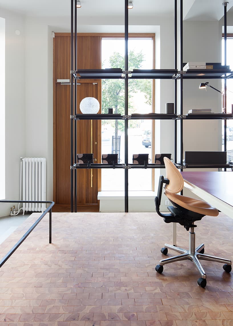 ”Den enskilt viktigaste komponenten i formgivningen av Behrer & Partners nya butikskontor är podierna där de sitter och arbetar. Genom att använda Almedalsgolvs kubbgolv i kombination med deras höga L-element på sidorna så fick vi fram den massiva men eleganta känsla i podierna som vi eftersträvade. De två butikskontoren skiljer sig i val av träslag som en återspegling av platsen i staden där de ligger. I Vasastansbutiken jobbade vi med en livlig furu och i Östermalmsbutiken med en diskret ek.”