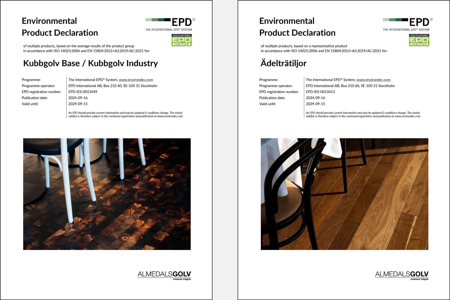 Almedalsgolv kan nu erbjuda EPD:er (Environmental Product Declaration) på flera av våra produkter, vilket ger dig insyn i hur våra material påverkar miljön. Med en EPD blir det enklare för dig att välja hållbara trägolv. Se våra EPD:er här.