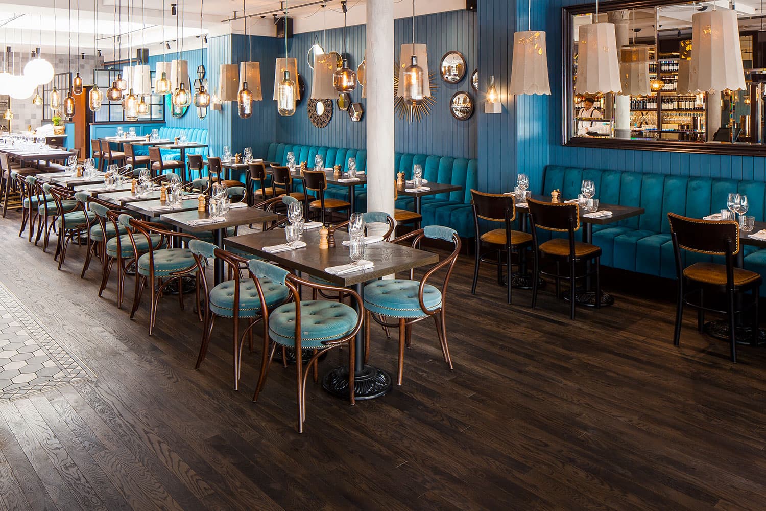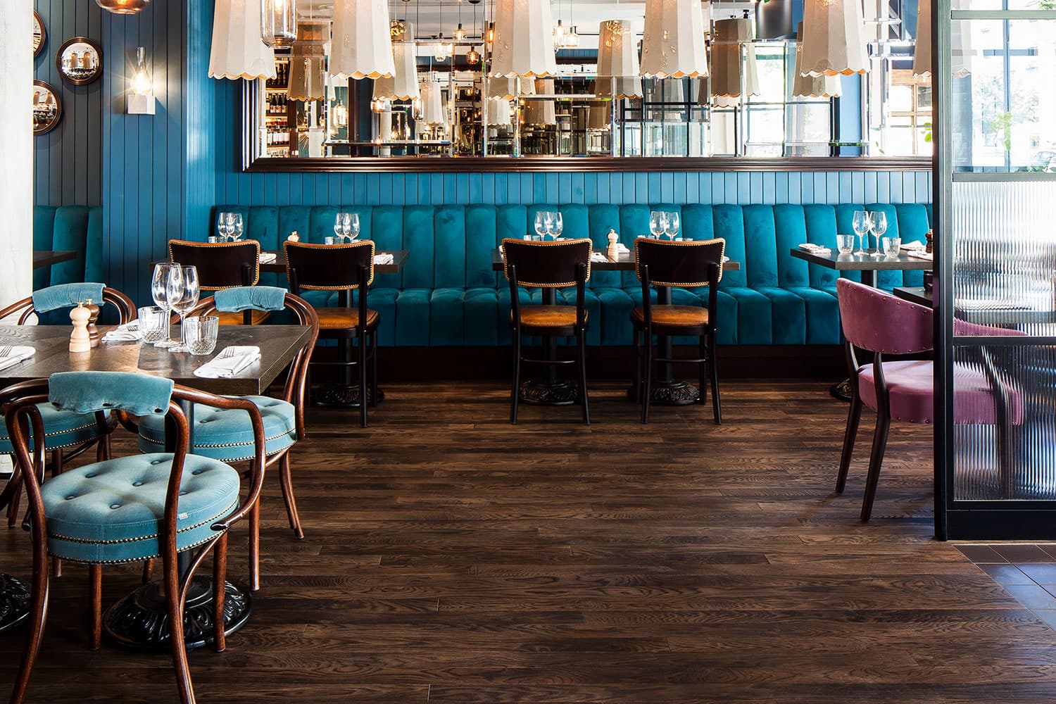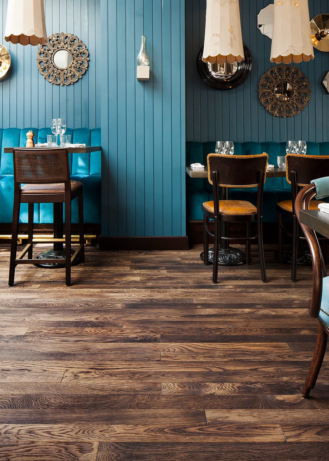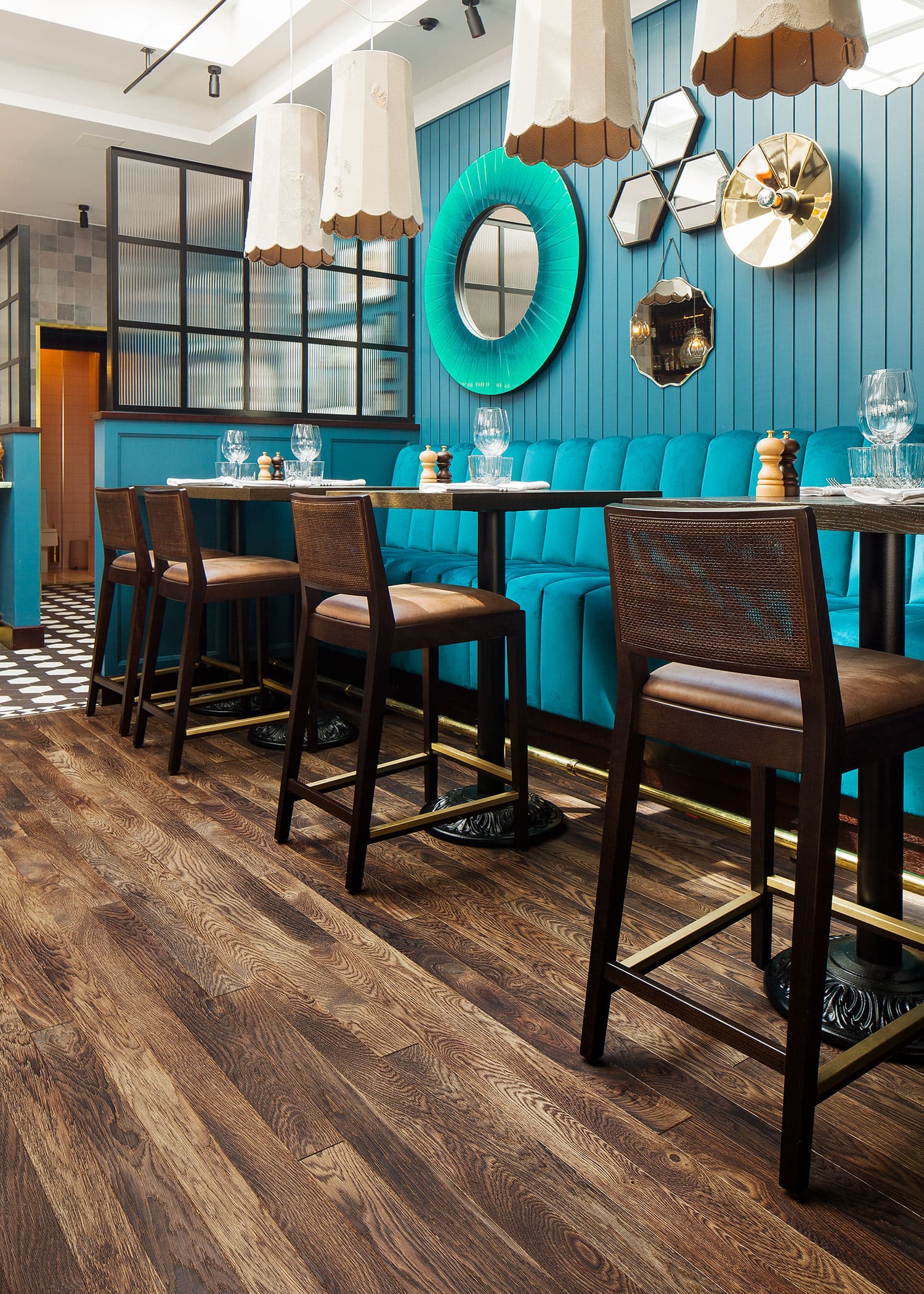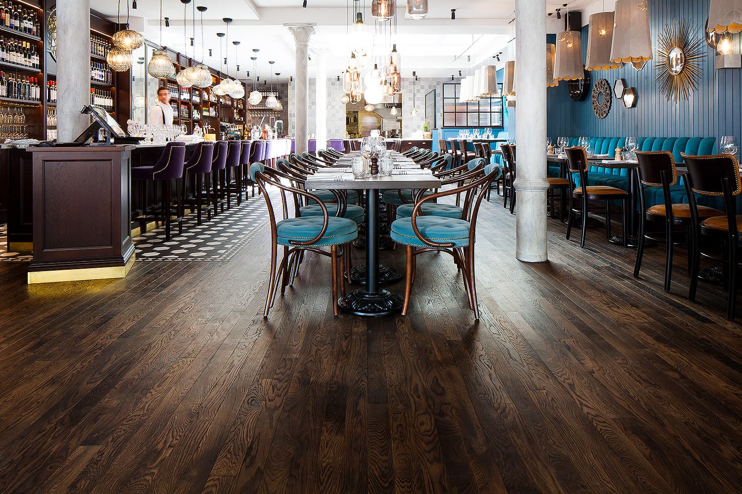 Italienska restaurangen Sorellina i Göteborg. Ädelträtiljor med ytbehandling 1838. 75 mm breda tiljor levererade i Typ 3.