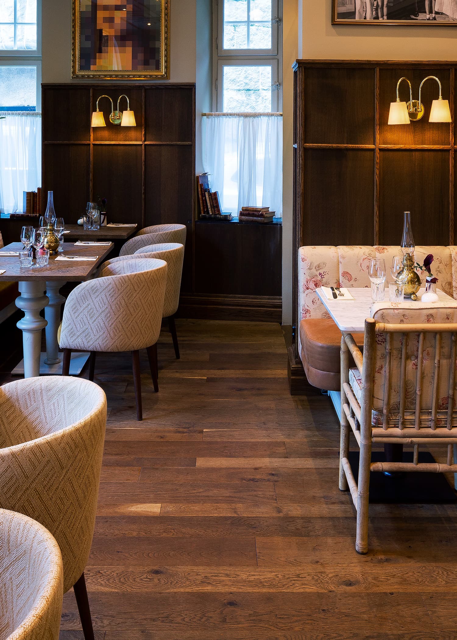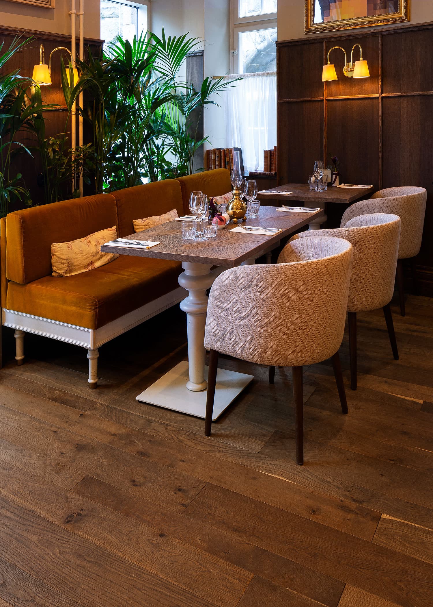 Varierade bredder och längder skapar ett livligt uttryck. Ädelträtiljor och Parkettstavar från Almedalsgolv tillverkas i sex olika standardbredder, från 68 mm till 180 mm. På The Vault är det lagt 95, 140 och 180 mm breda tiljor.