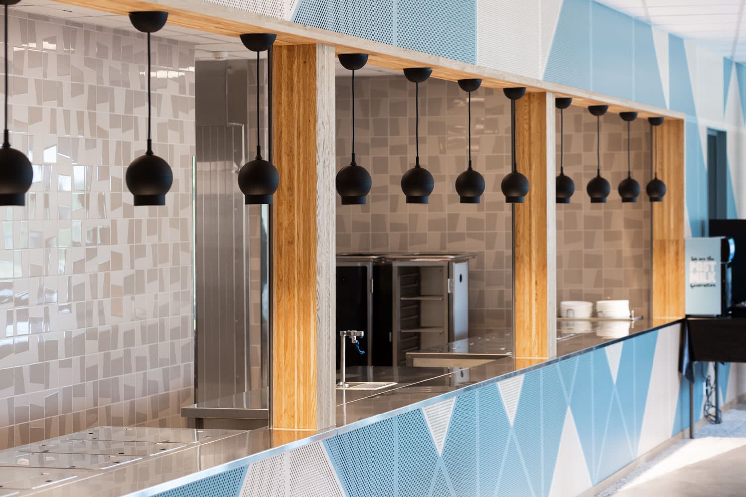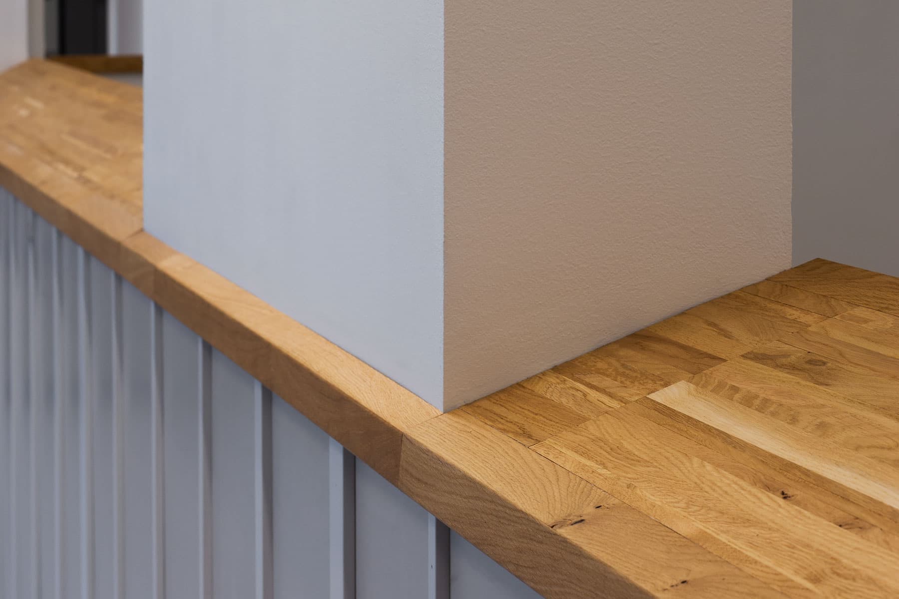Till trappan levererades även detaljer i samma material. På flera våningsplan löper bland annat handledare i matchande utseende, levererat anpassat efter mått och vinklar.