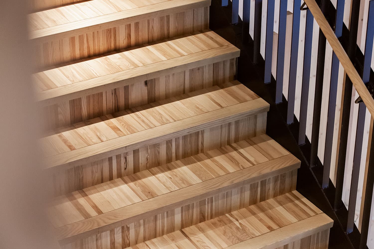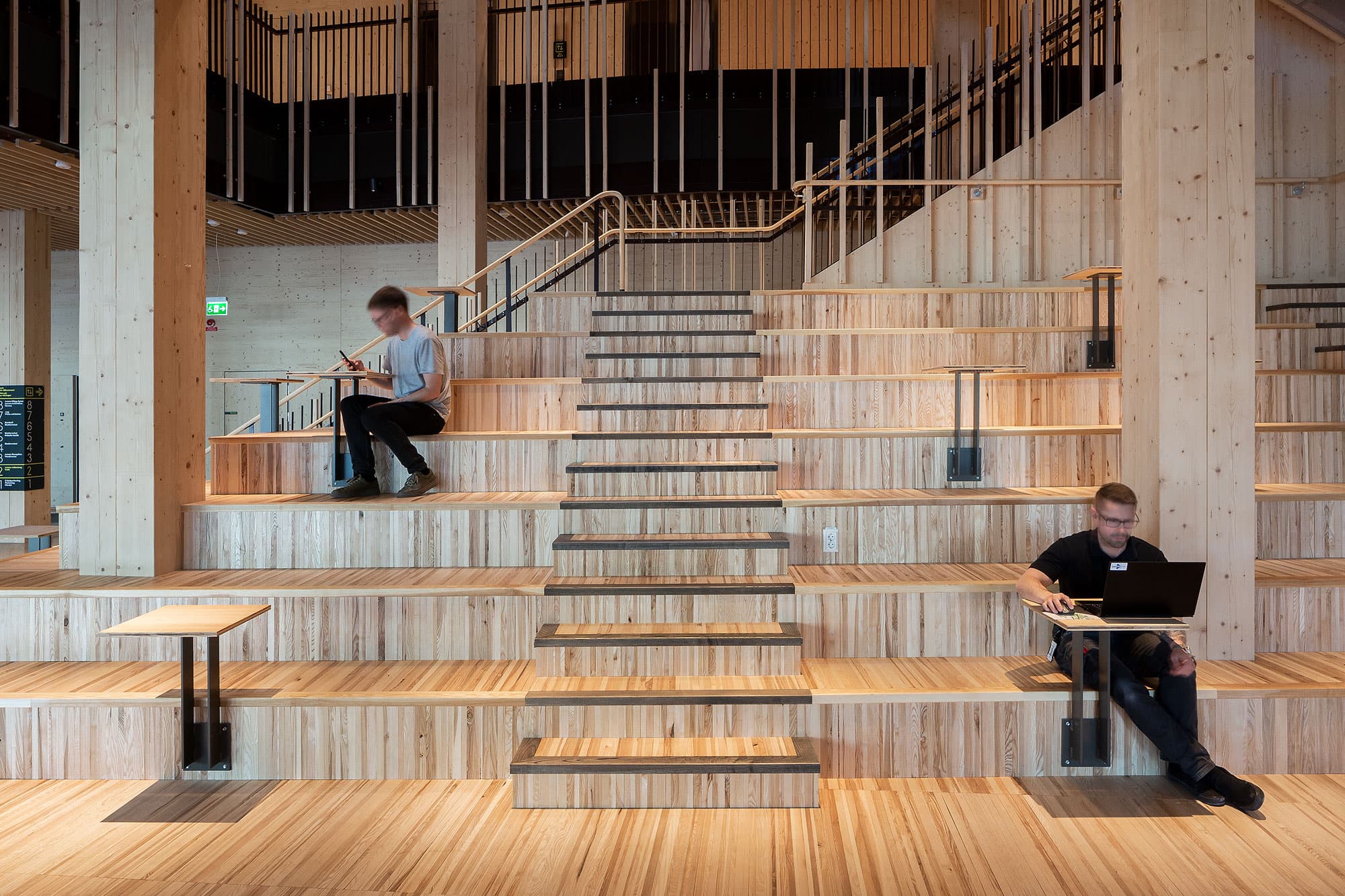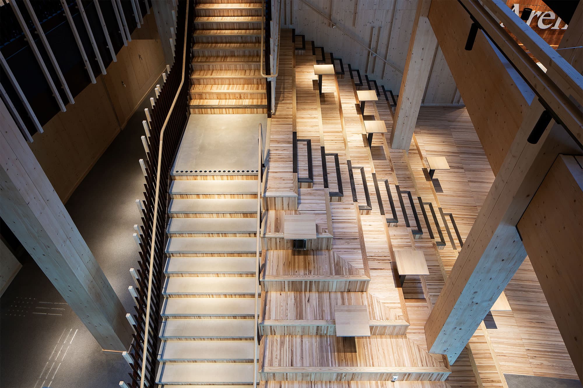 Trappa och gradäng till Magasin X i Uppsala. Trappan och sittgradängen är tillverkad av vår Industriparkett Design XL i ask. Sätt- och plansteg levereras måttanpassade, slipade och ytbehandlade med sidenmatt hårdvaxolja.
