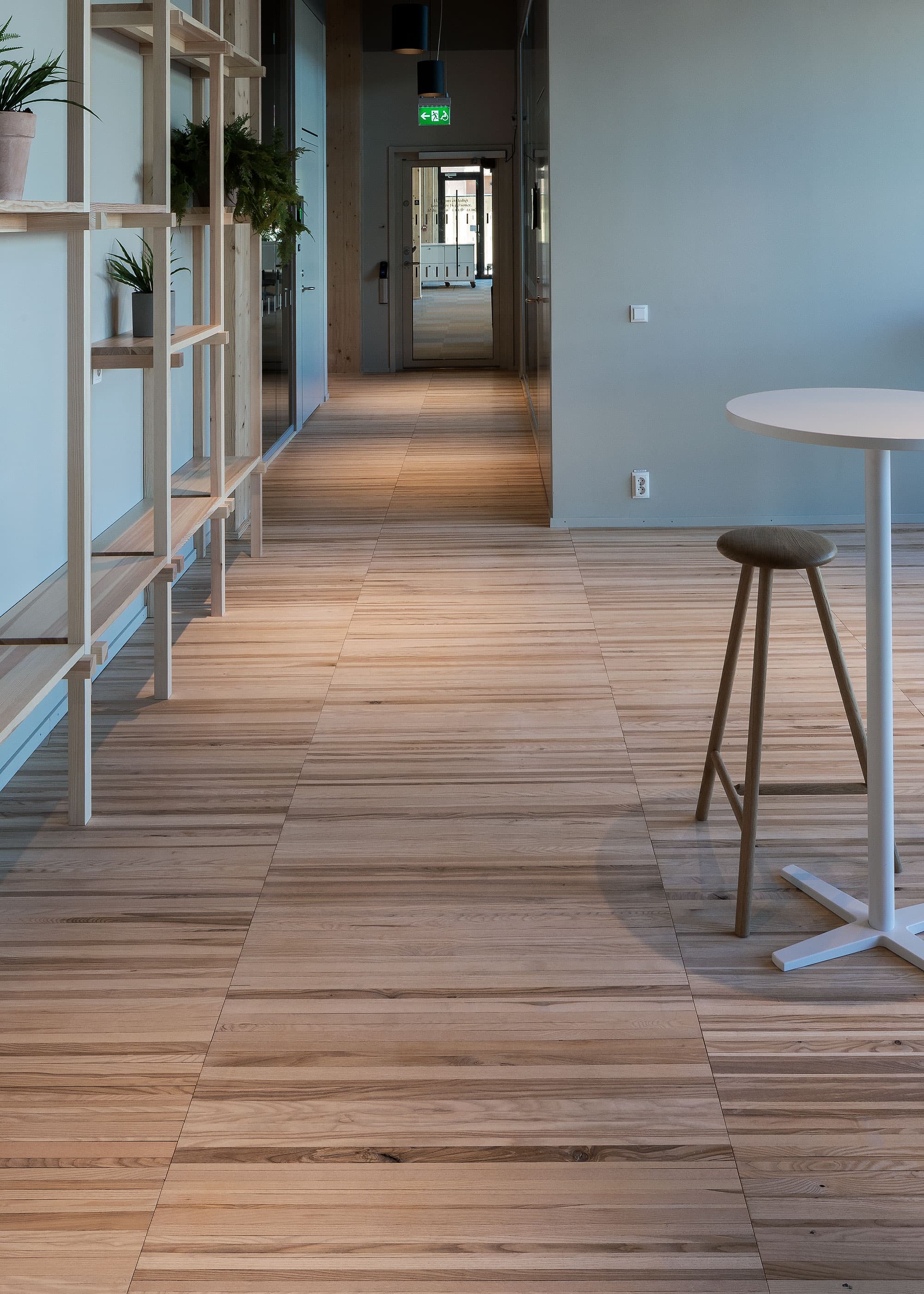 ”I Magasin X testar vi ett spillvirkesgolv från Almedalsgolv. Och vi pratar inte om andrasortering! Snarare fjärdesortering kanske, alltså träspill som annars kulle gått direkt till fjärrvärmeverket och bara eldats upp. Vi fick verkligen dammsuga marknaden för att hitta ett riktigt smart, cirkulärt trägolv. Här är det en leverantör som tänkt till och skapat en ny produkt av råvaror som annars skulle gått till spillo.”