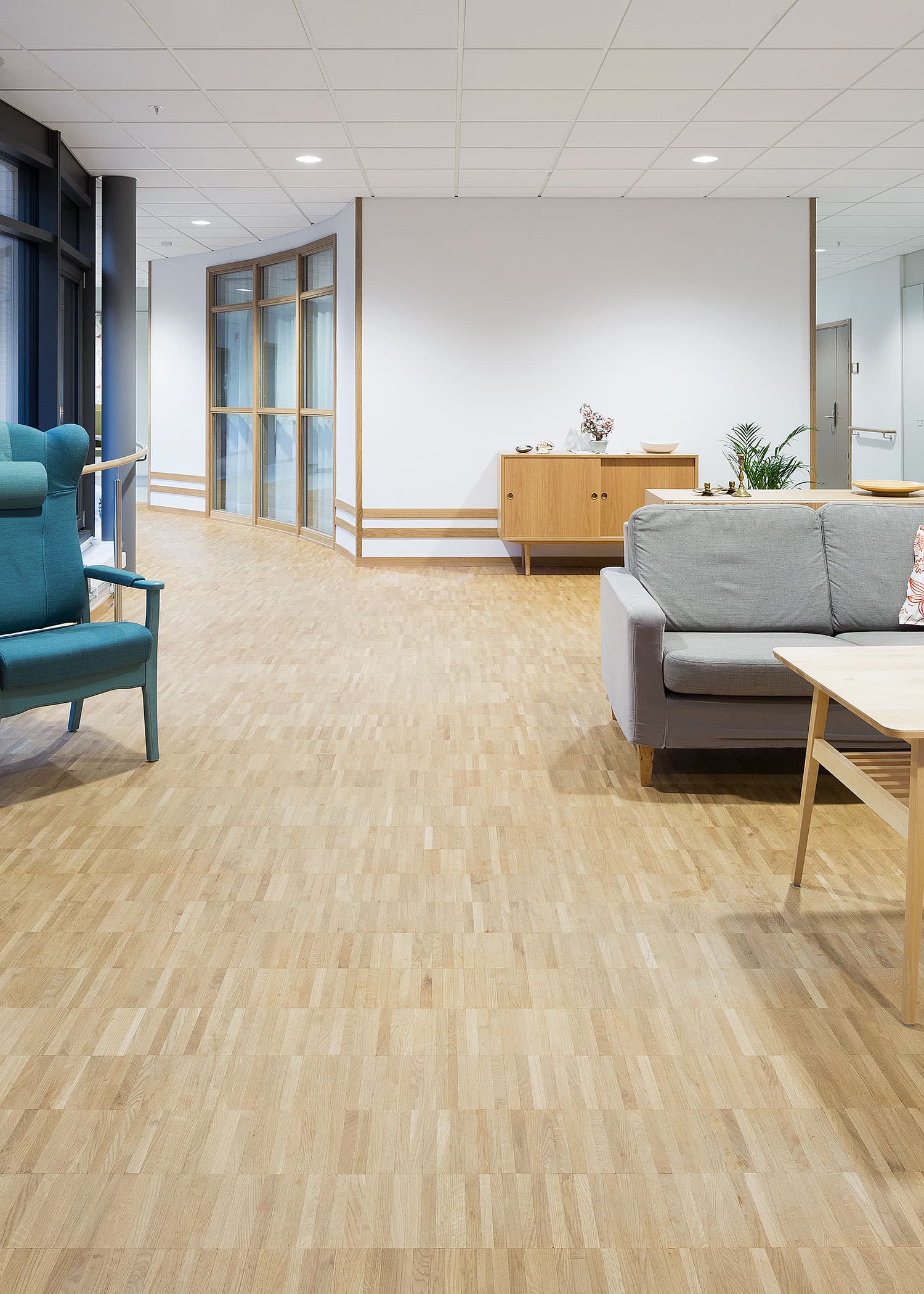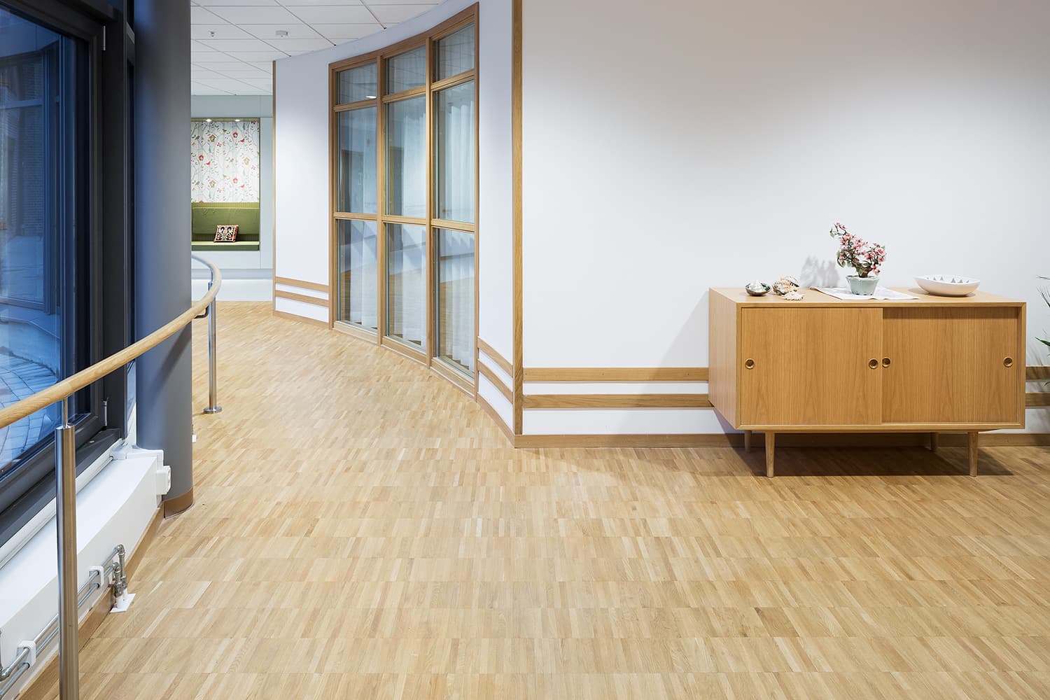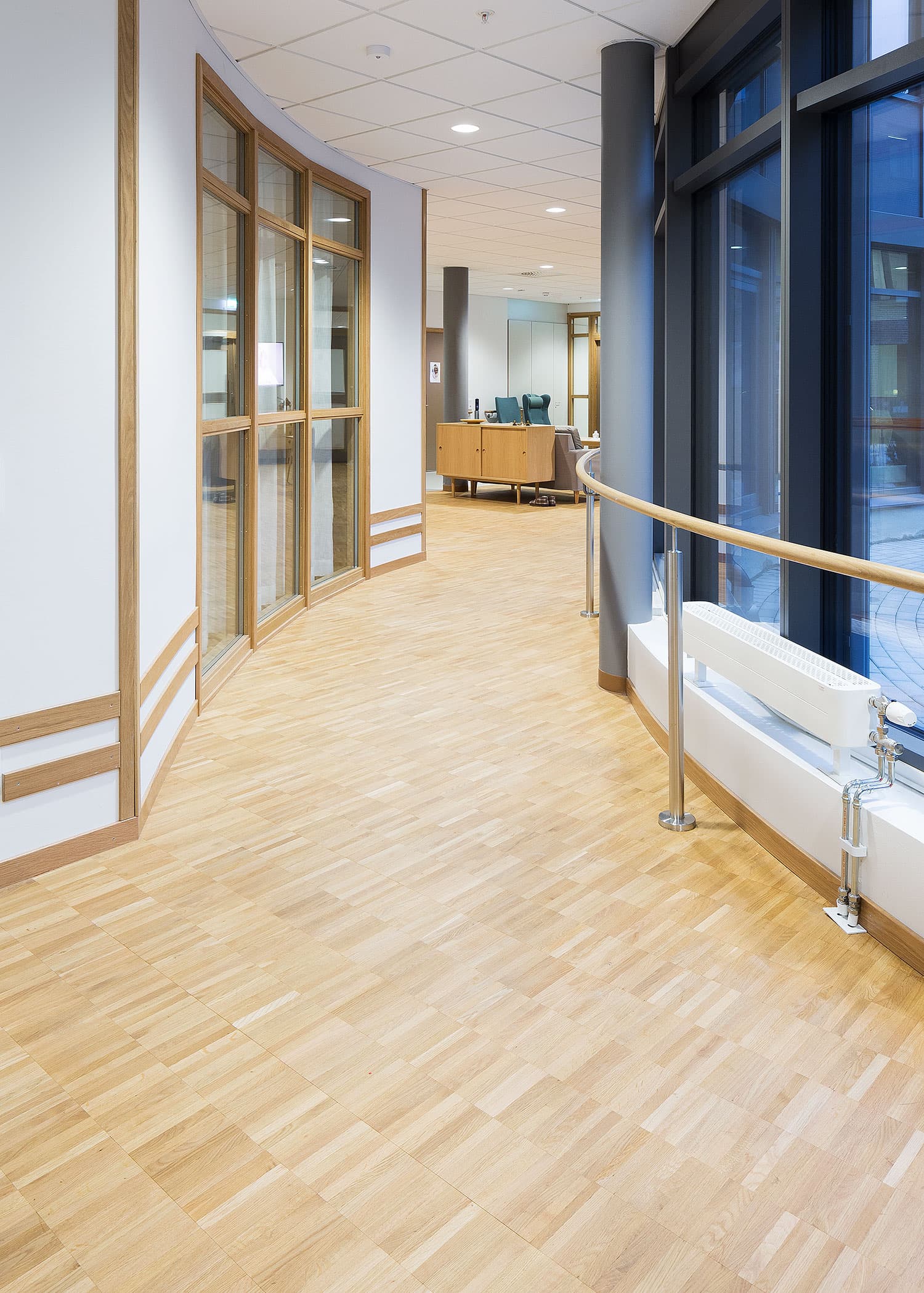 Med Almedalsgolvs Industriparketter går det att göra snygga möten mellan material utan golvsocklar eller lister. Detta tack vare hellimning mot underlaget.