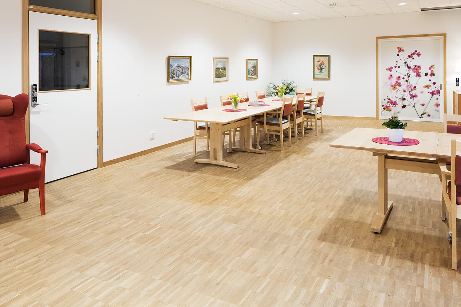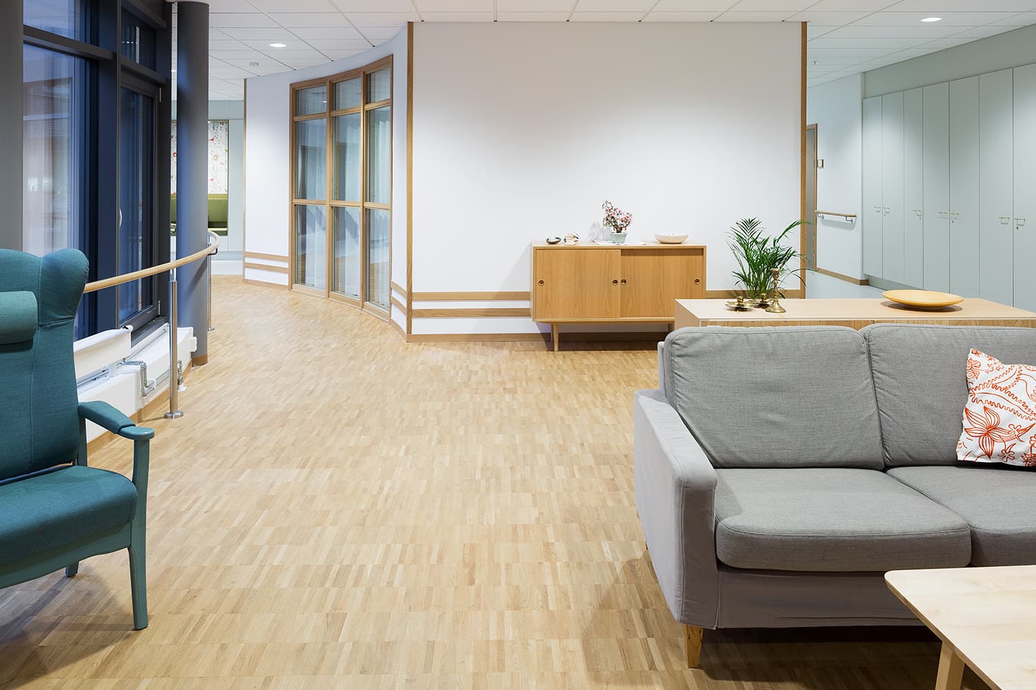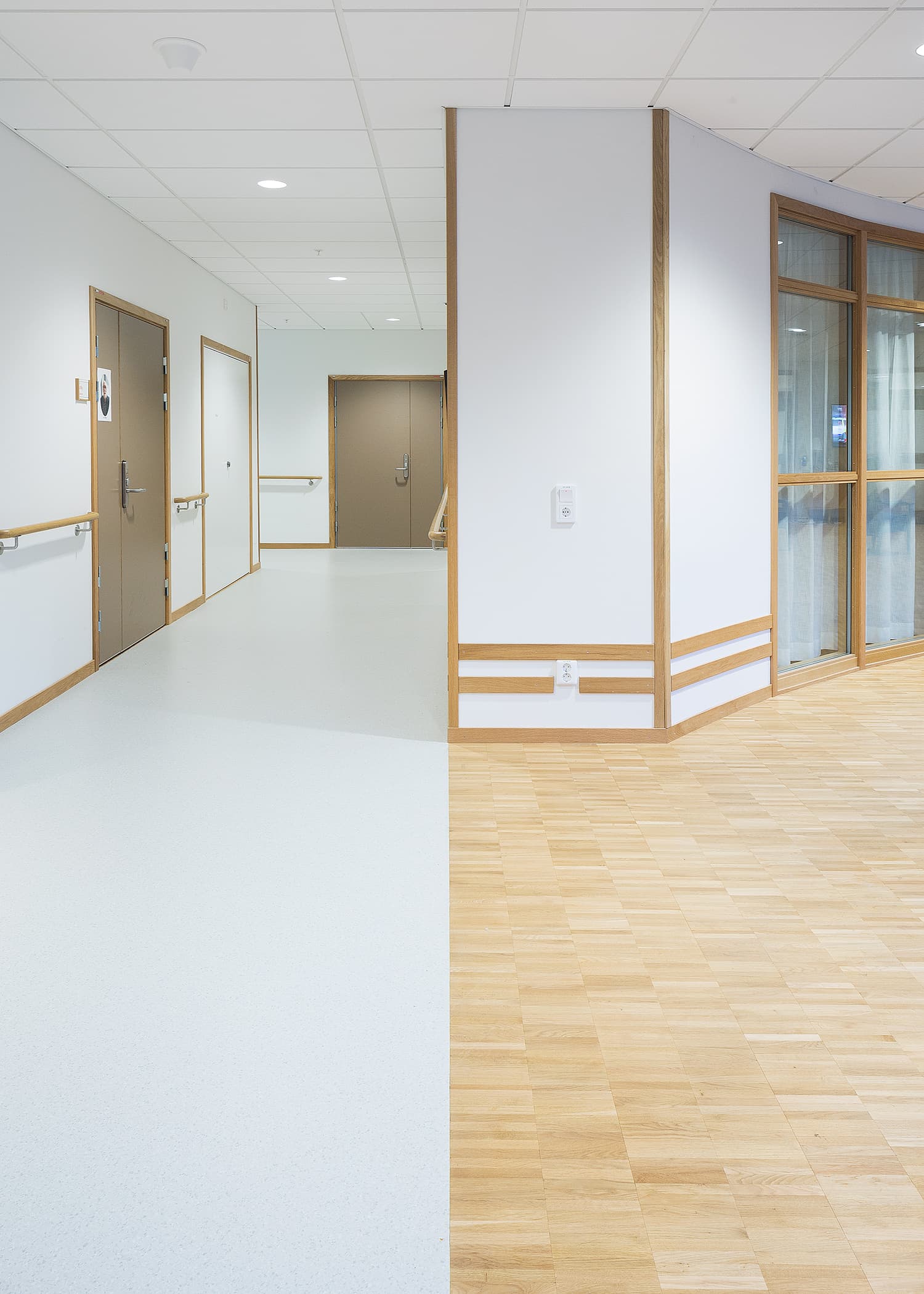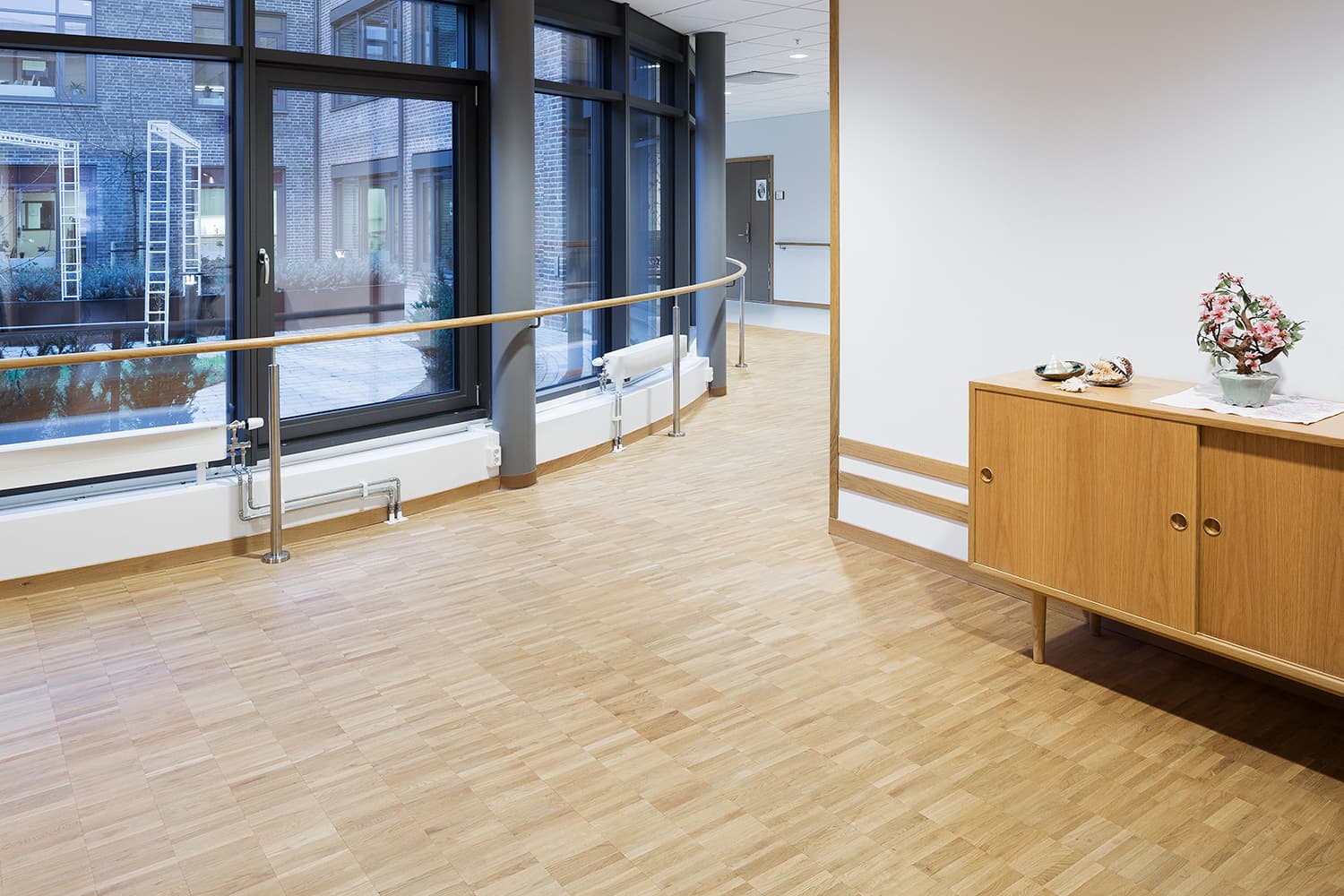Med Almedalsgolvs Industriparketter går det att göra snygga möten mellan material utan golvsocklar eller lister. Detta tack vare hellimning mot underlaget.