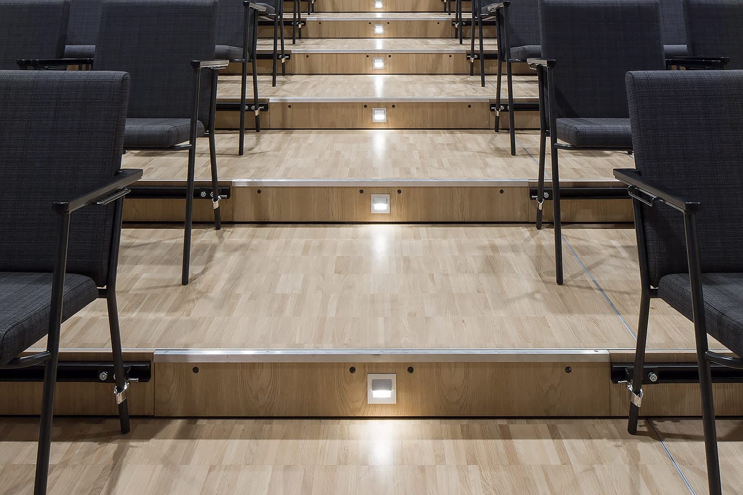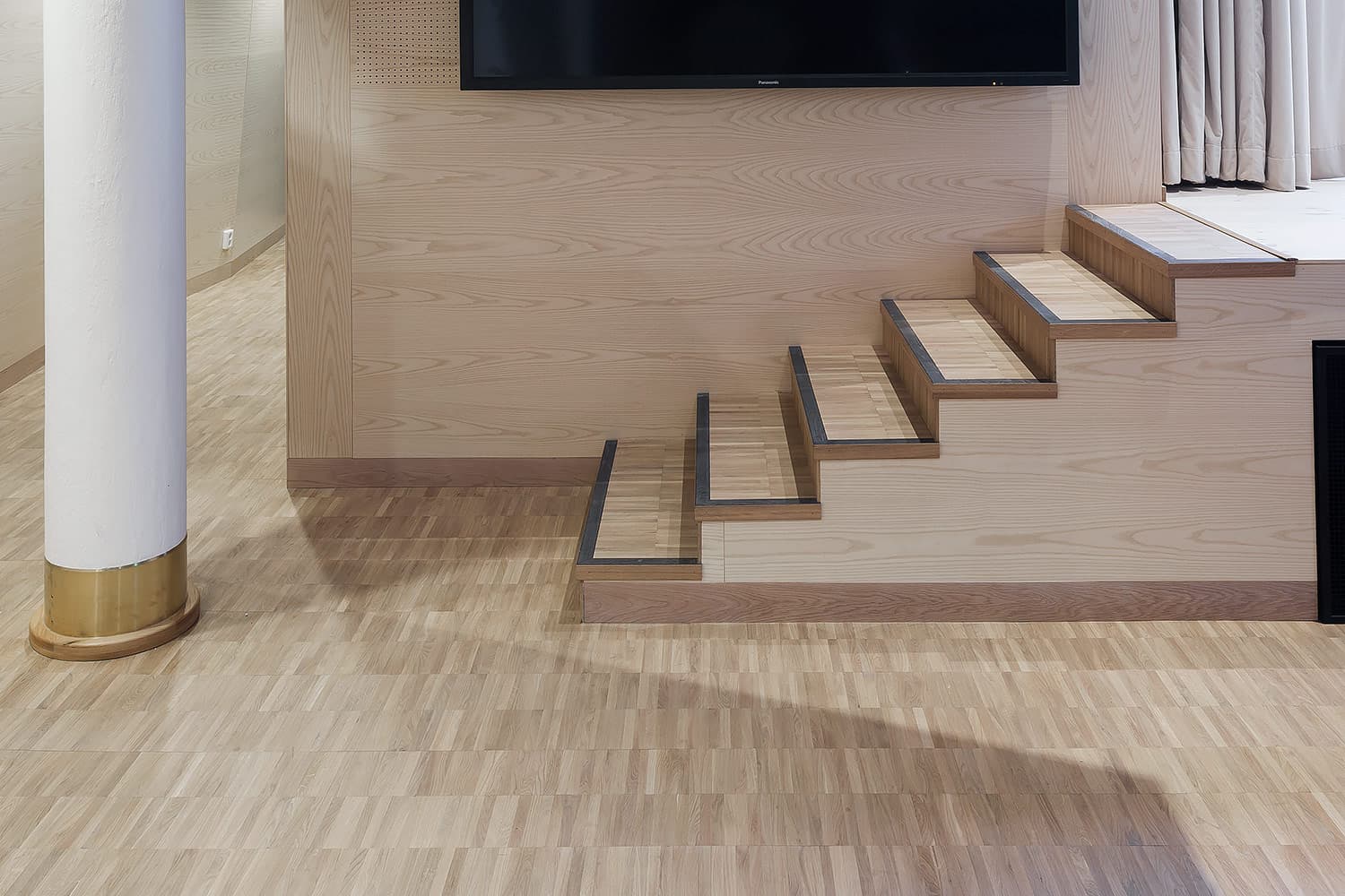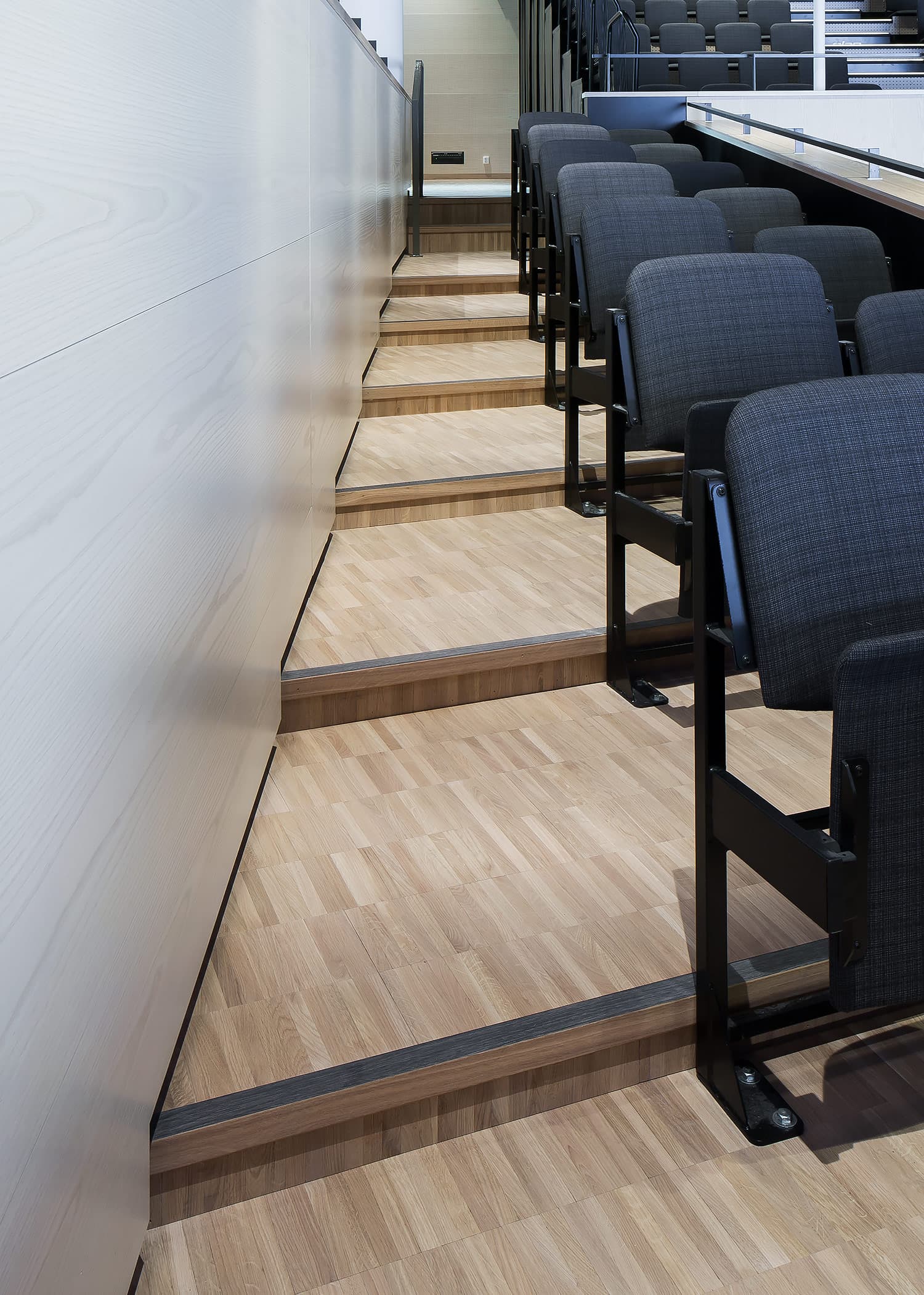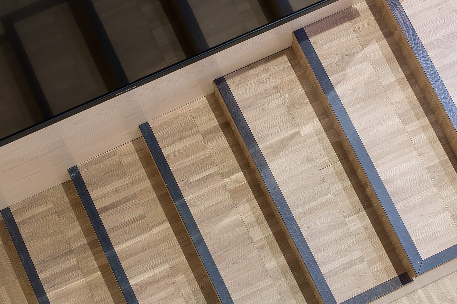 Trapporna består av vår industriparkett Design 2.0 samt fabriksfärdiga trappnosar med integrerad kontrastmarkering.