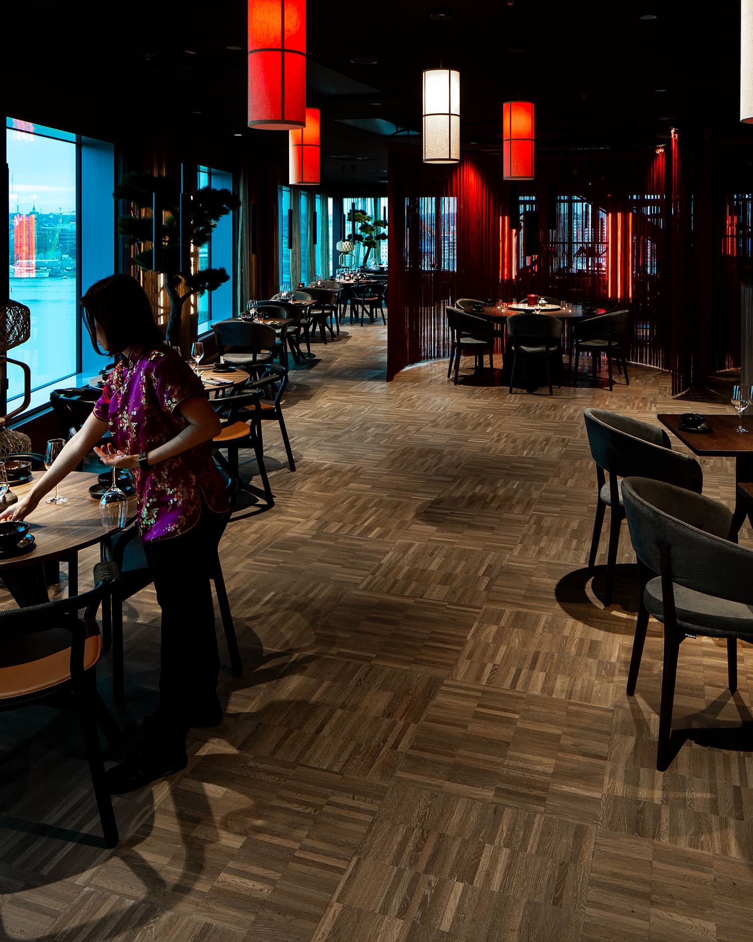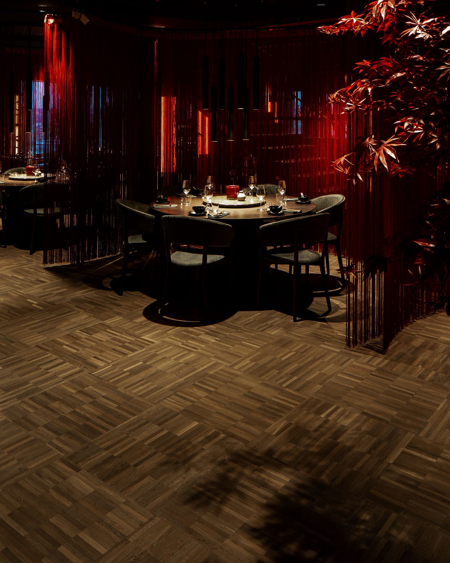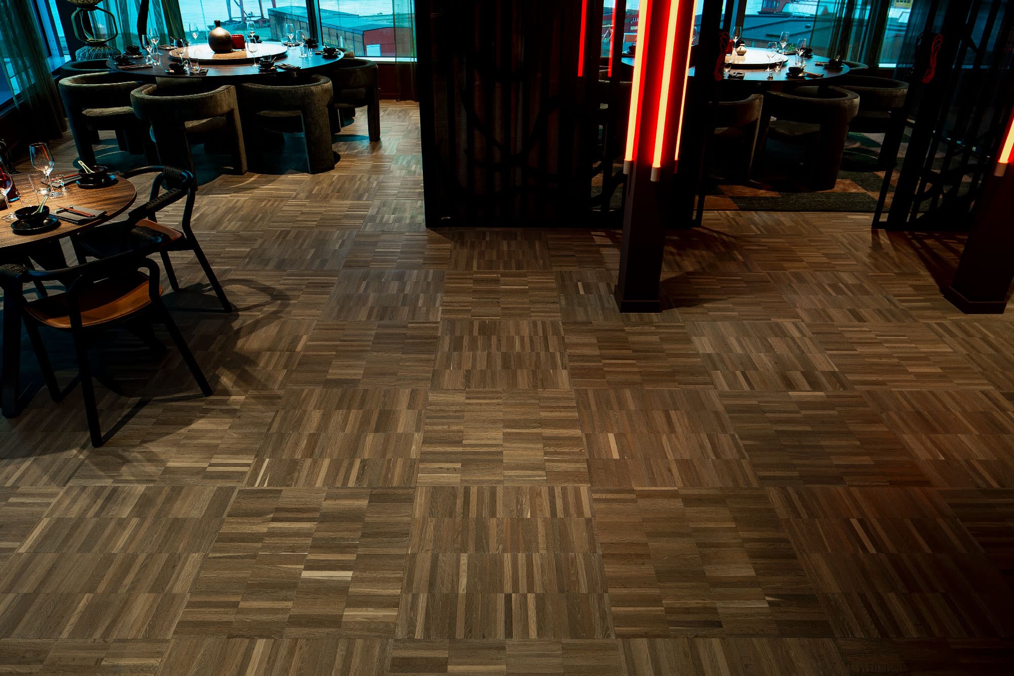 Kinesiska restaurangen Fei på Hisingen i Göteborg. Industriparkett Design 2.0 med ytbehandling 1415. Levererat måttanpassat för mönsterläggning i kvadrater.