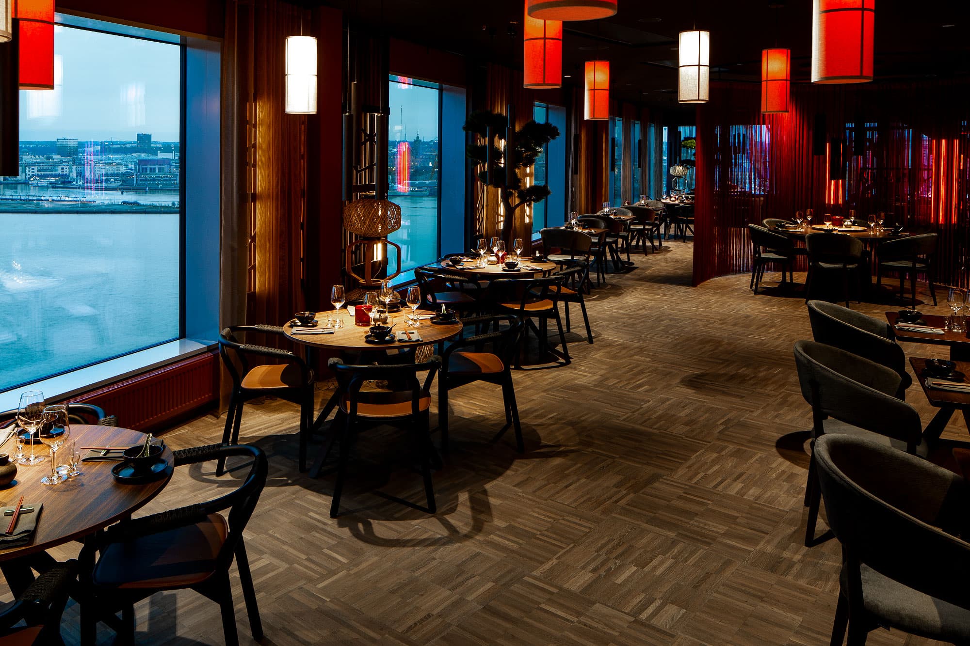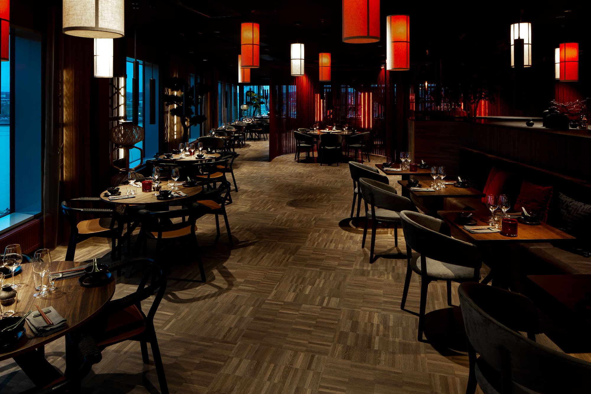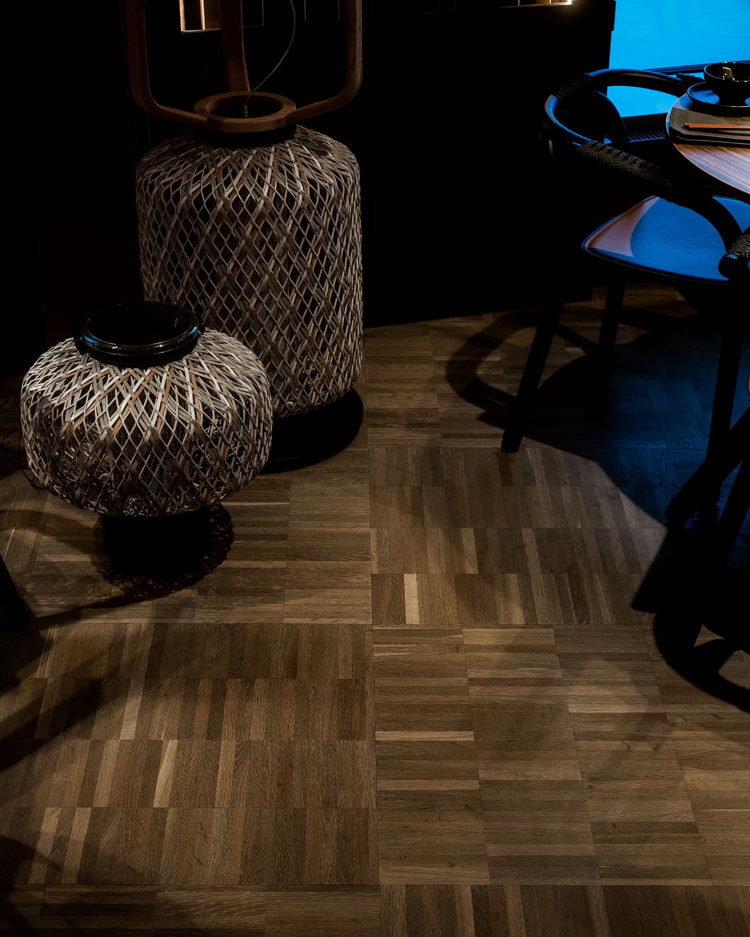 Kinesiska restaurangen Fei på Hisingen i Göteborg. Industriparkett Design 2.0 med ytbehandling 1415. Levererat måttanpassat för mönsterläggning i kvadrater.