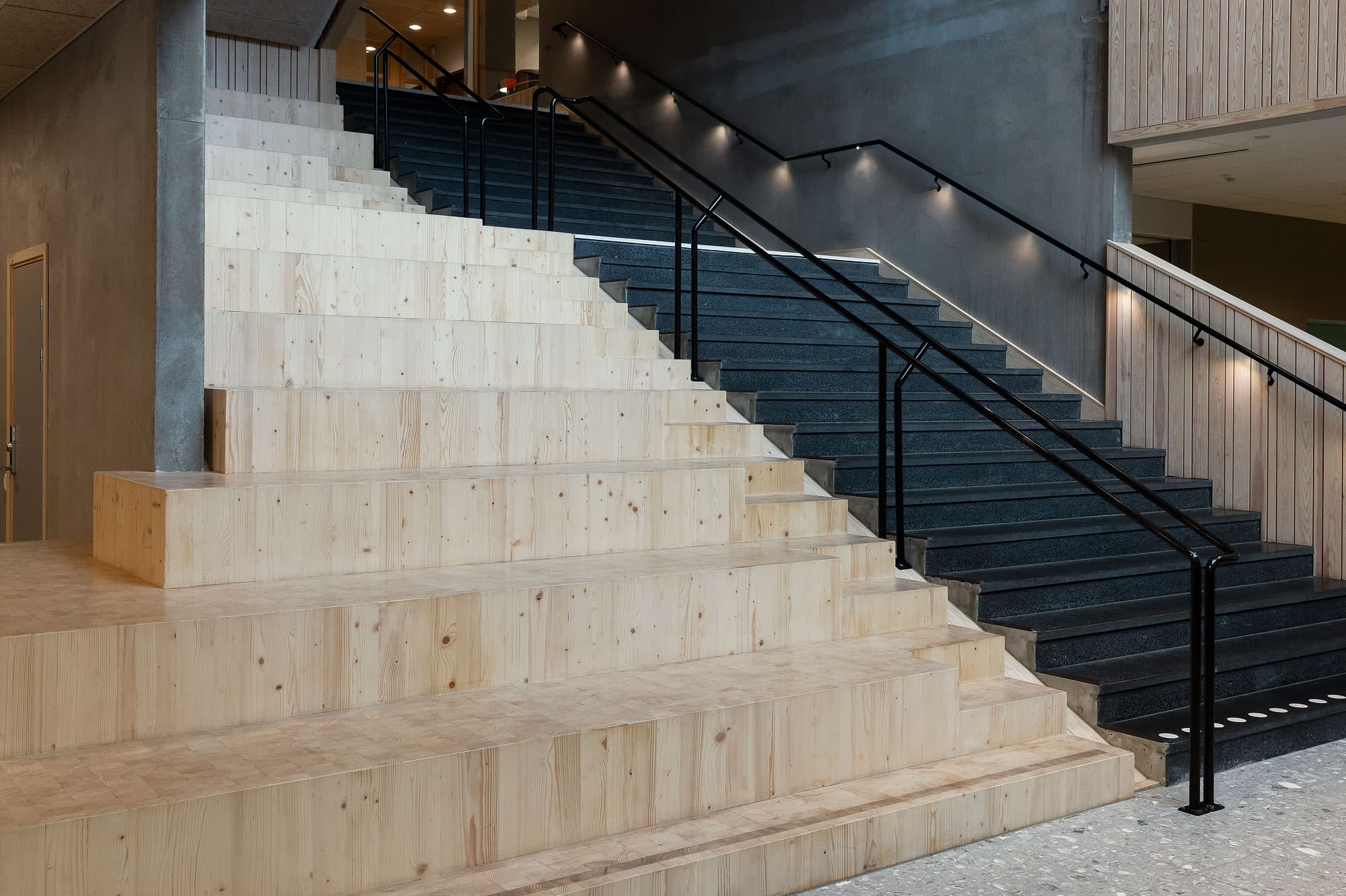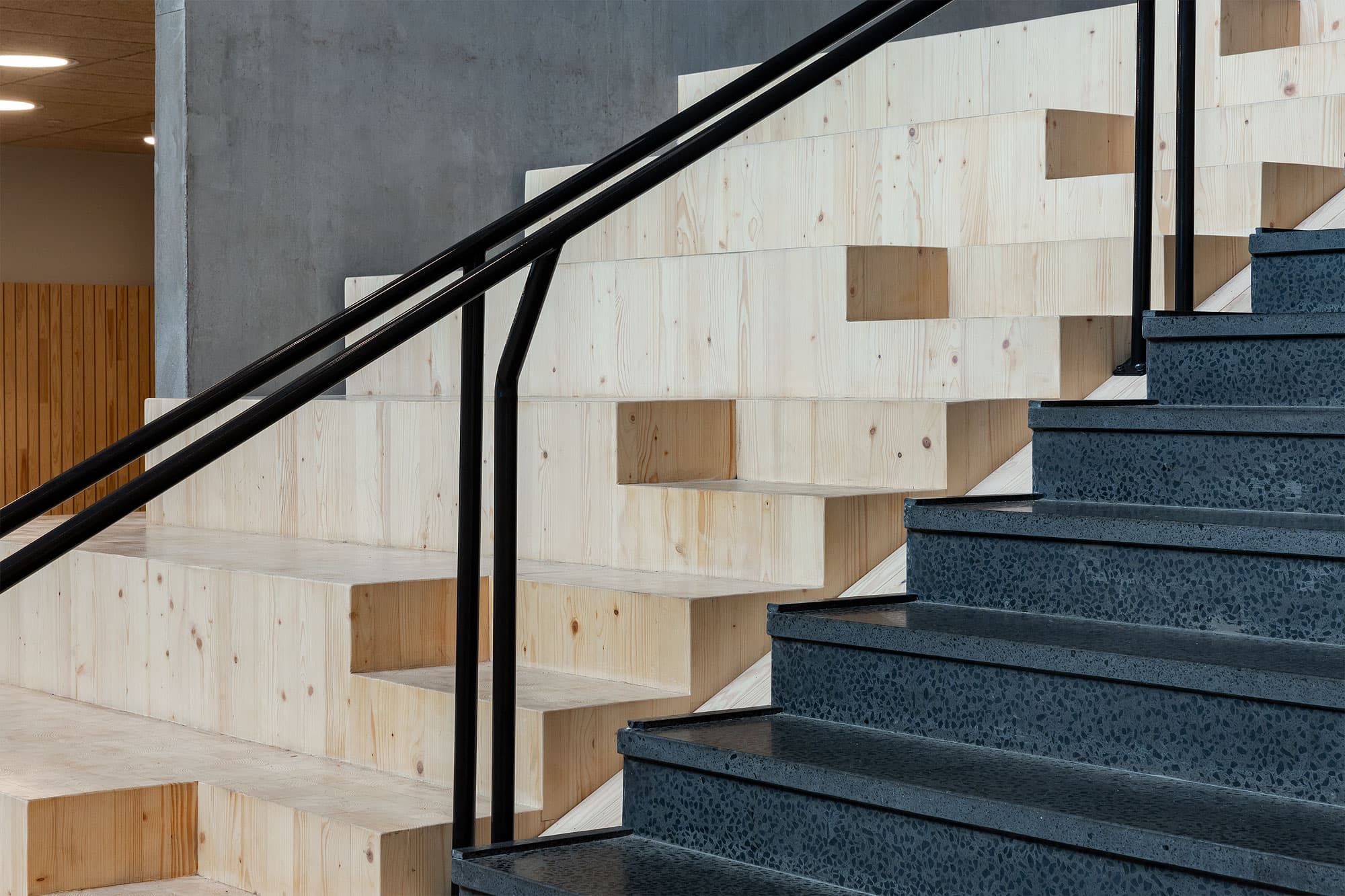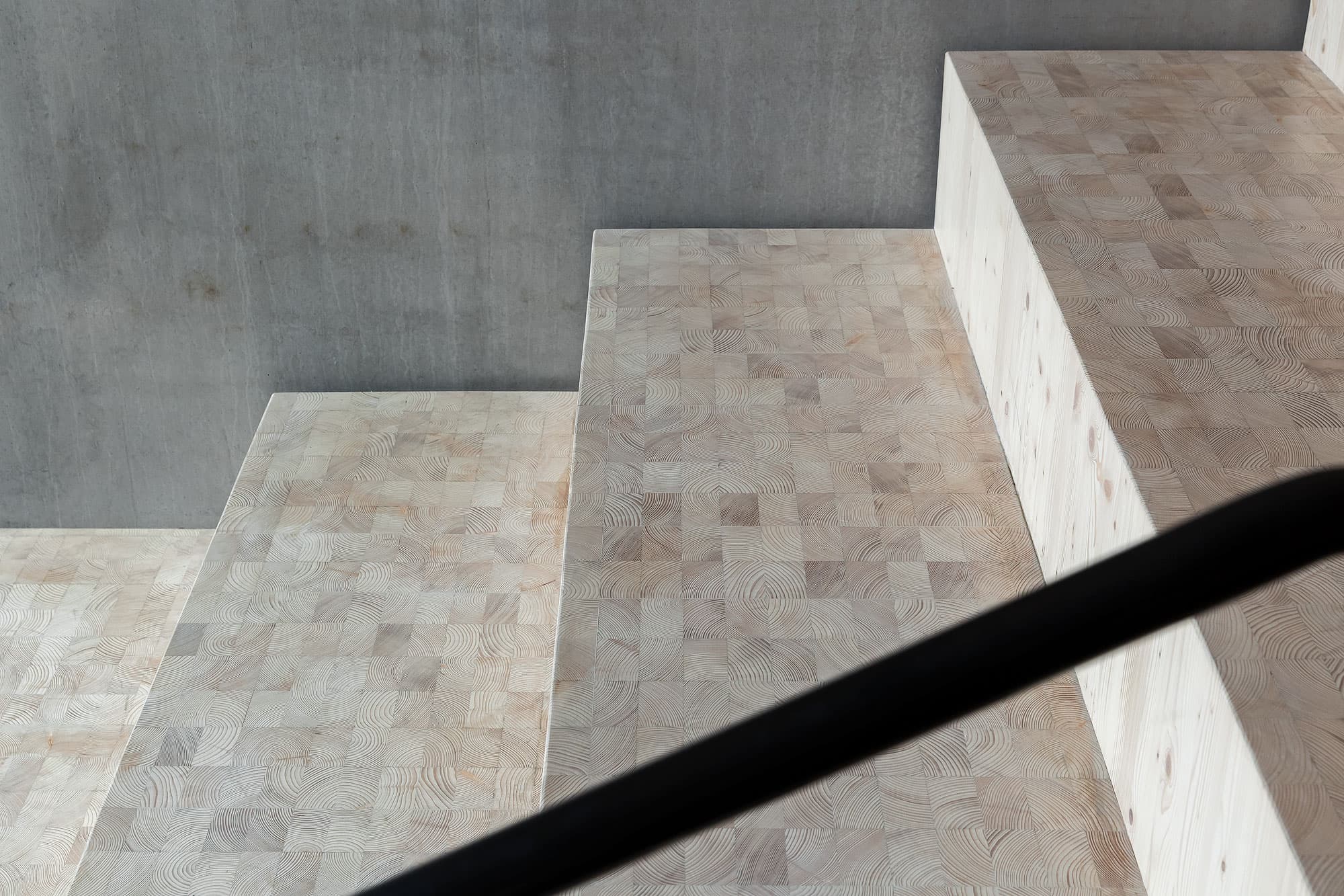 Gradängtrappa i massiv grankubb. Trappdelarna levereras som måttanpassade plan- och sättsteg vilket förenklar monteringen på plats.
