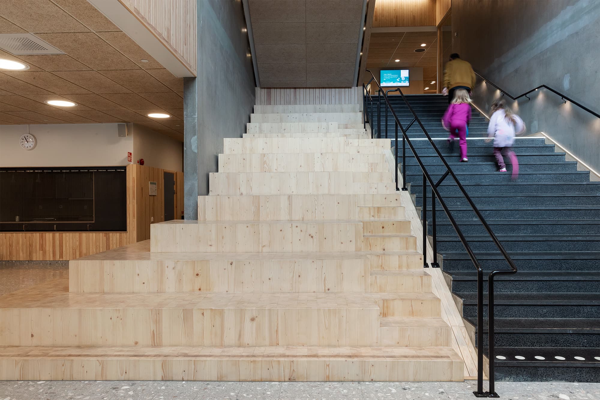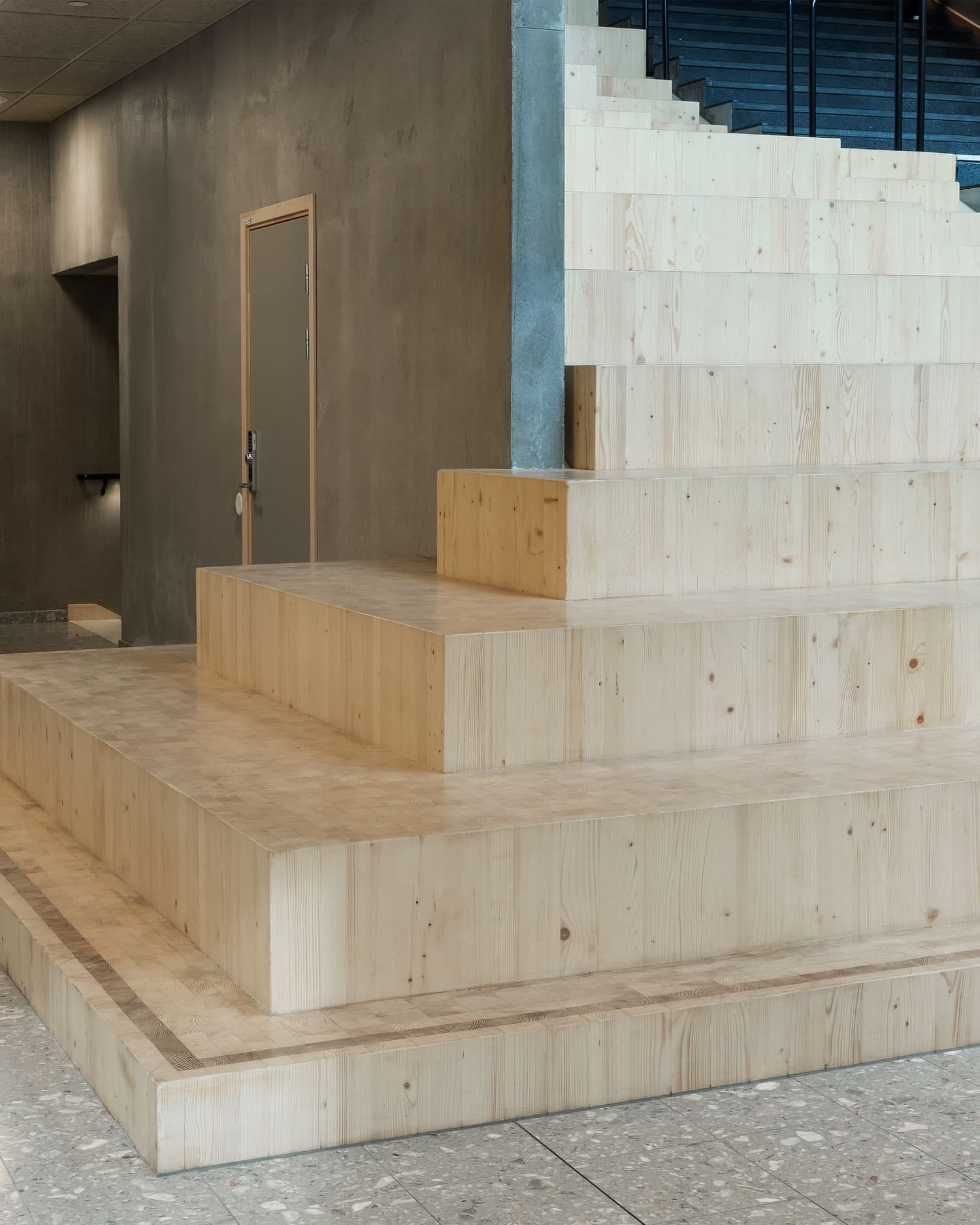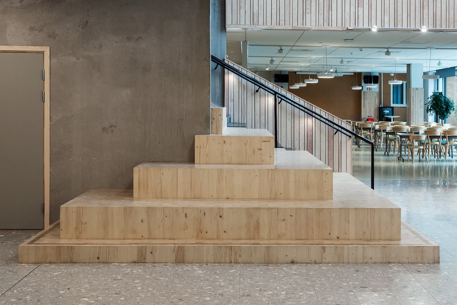 Gradängtrappa i massiv grankubb. Trappdelarna levereras som måttanpassade plan- och sättsteg vilket förenklar monteringen på plats.