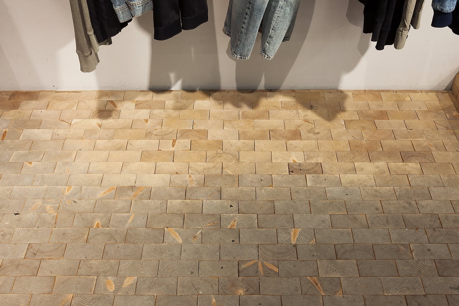 Golv från arkivet. Nudie har valt att lämna golvet helt obehandlat. Lämnar man furukubben obehandlad får det med tiden en grå och tät yta, naturligt patinerad. Bilderna är tagna ca fyra år efter det att golvet las in.