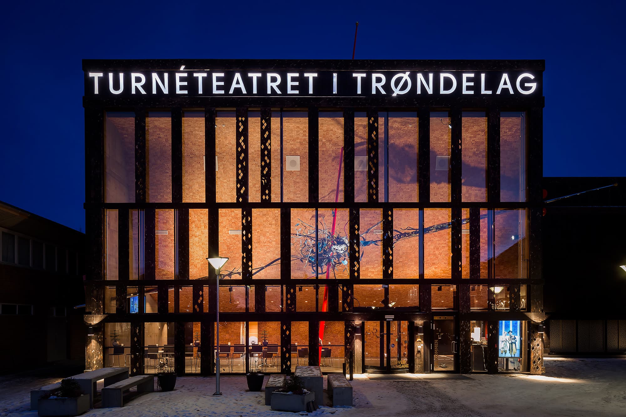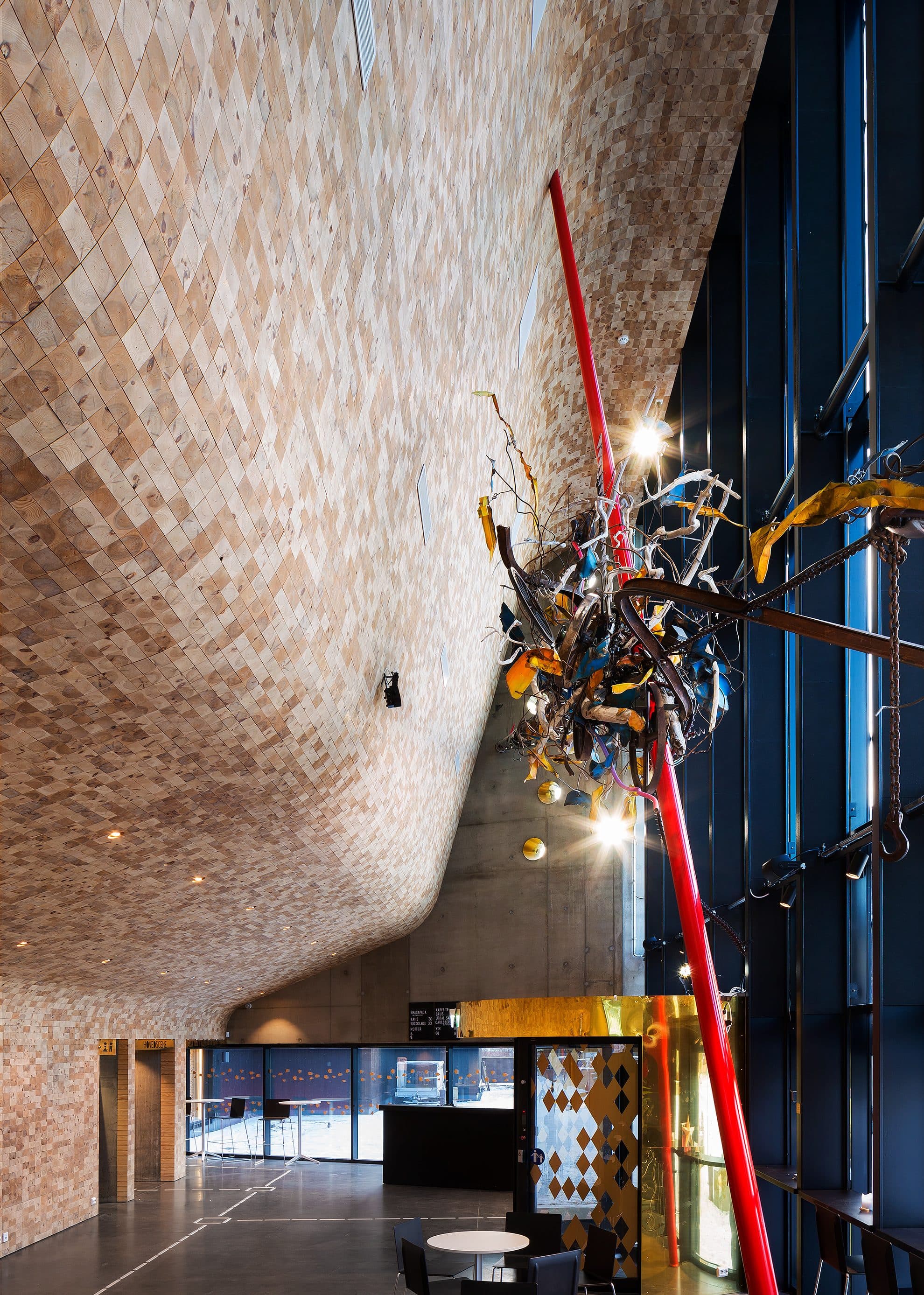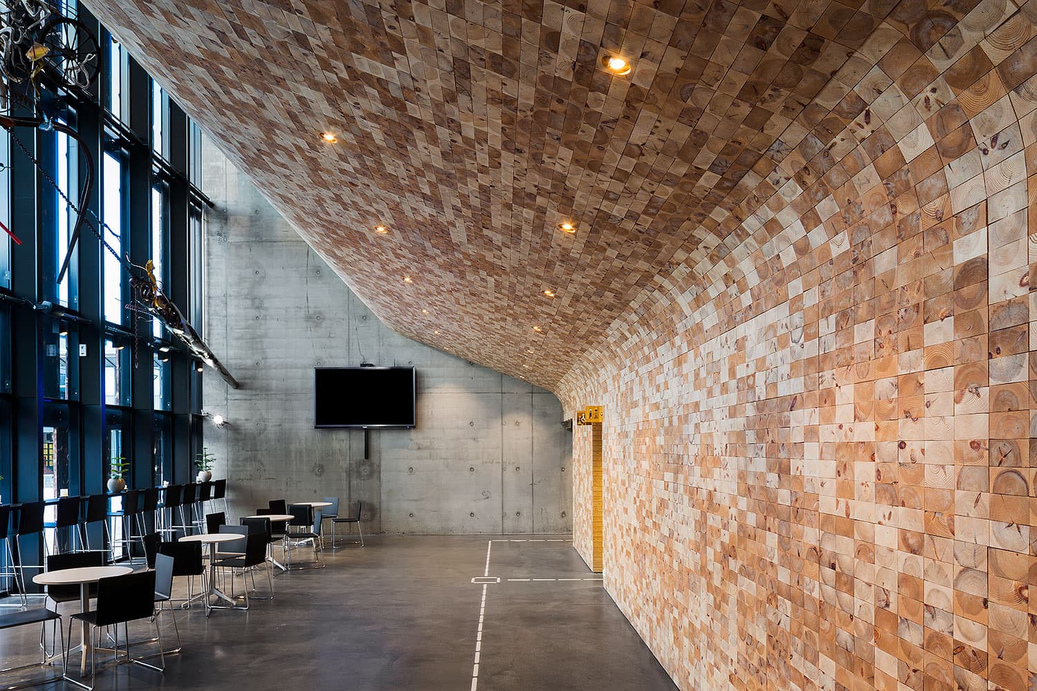 ”Bak ideen lå et sterkt ønske om å benytte tre både utvendig og innvendig i bygget. Tre er vakkert, det er ikke spesielt dyrt, og det blir bare vakrere med tiden. Ideen med kubbeveggen var å skape en følelse av et snitt gjennom en kjempestor stabel med trelast, og at innganger til teatersalen og til toalettene var skåret ut i denne stabelen, dvs skape en slags massivitet og styrke. Tre er også et varmt materiale, som gir en lun atmosfære i foajéen.”