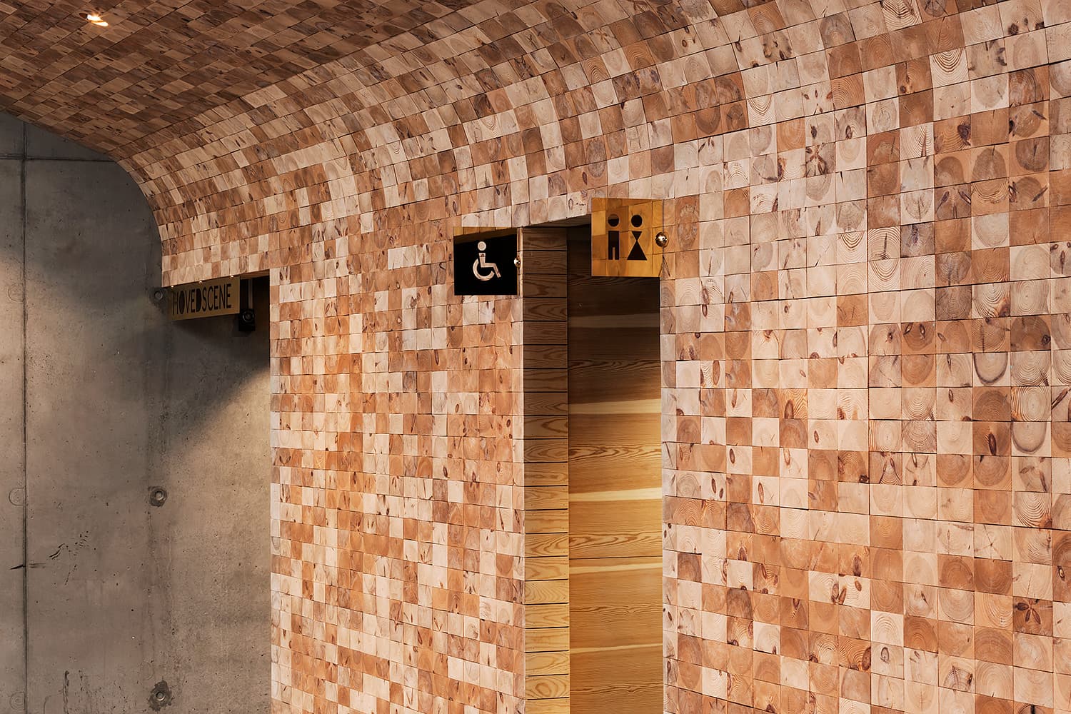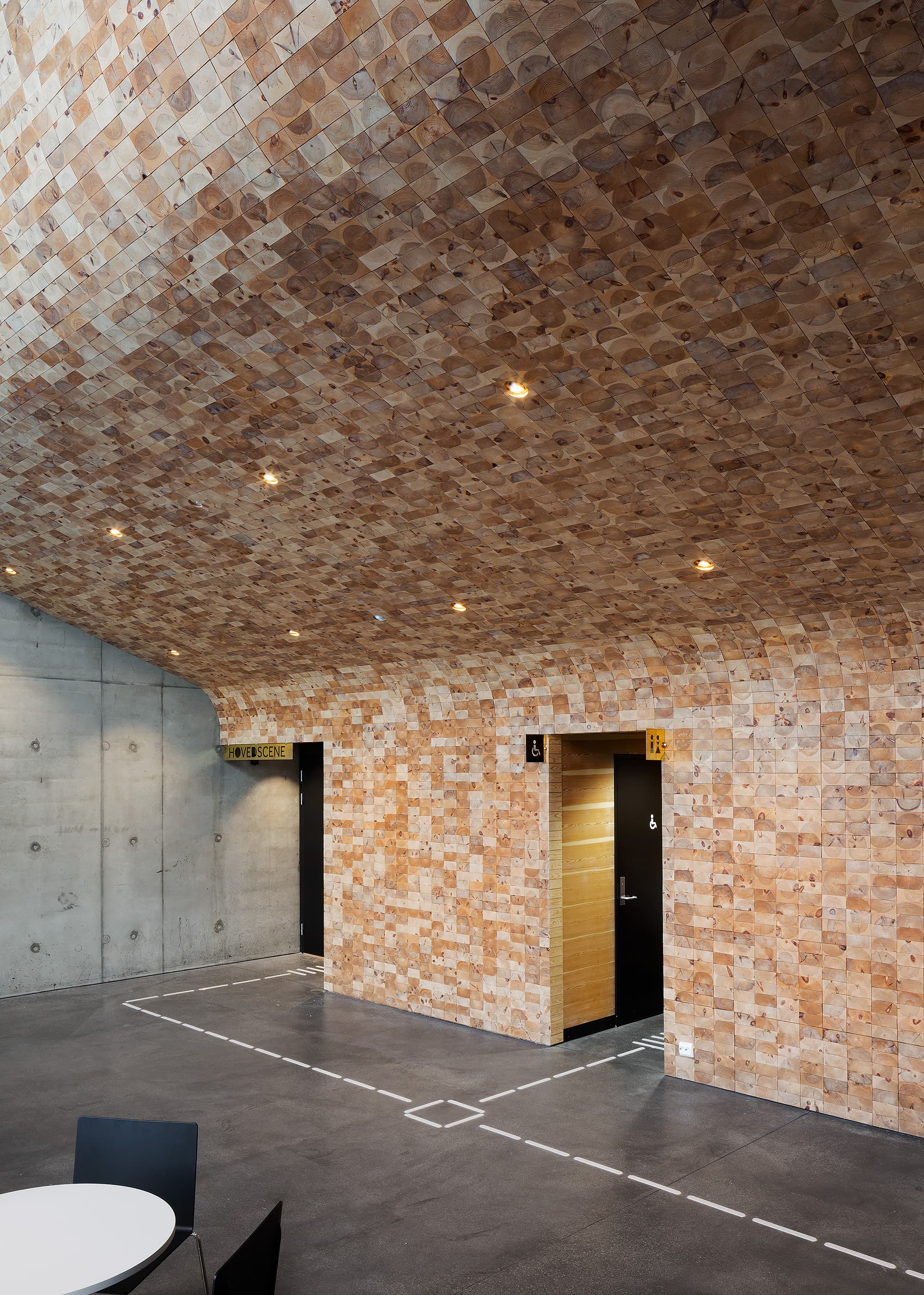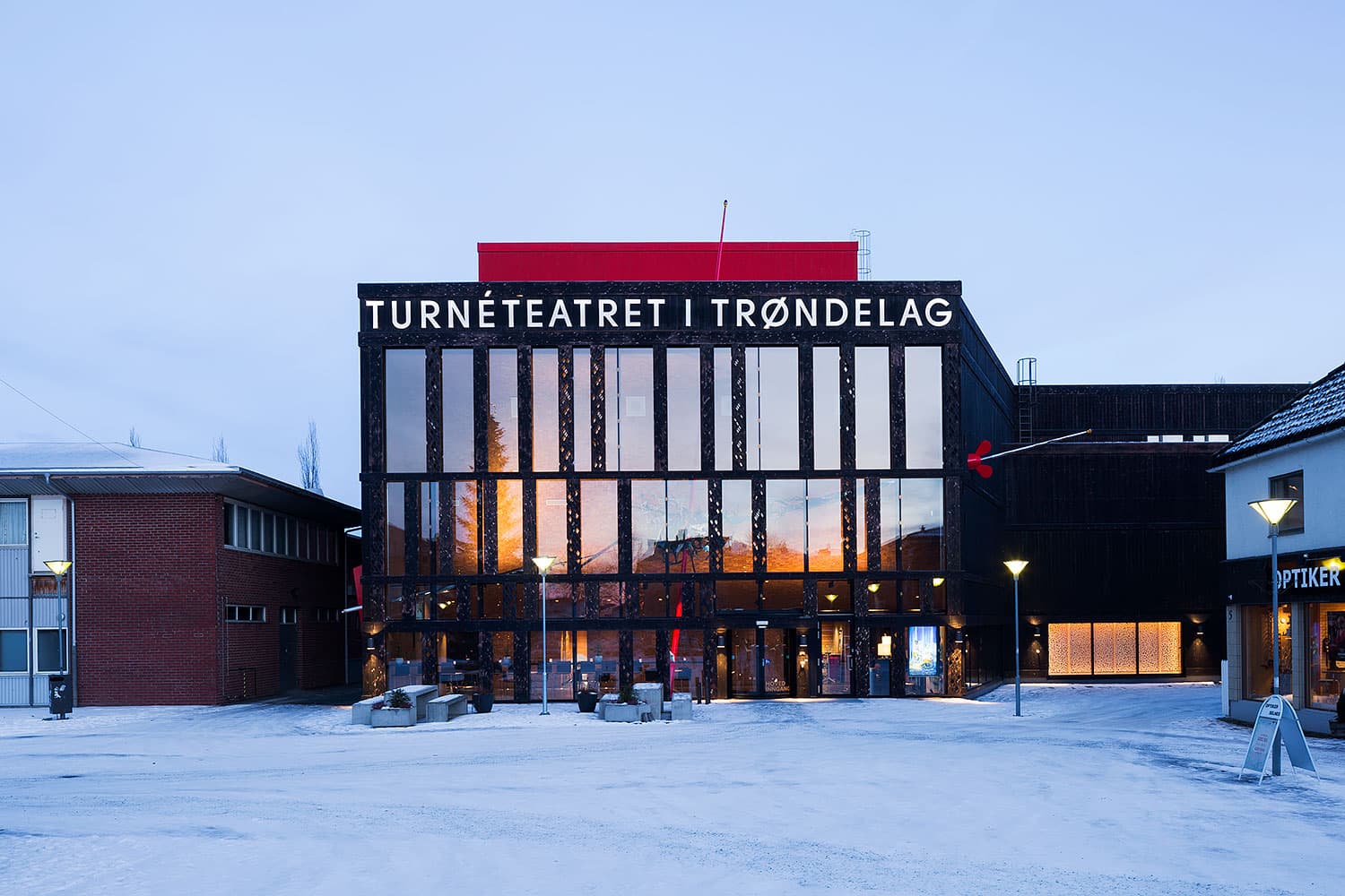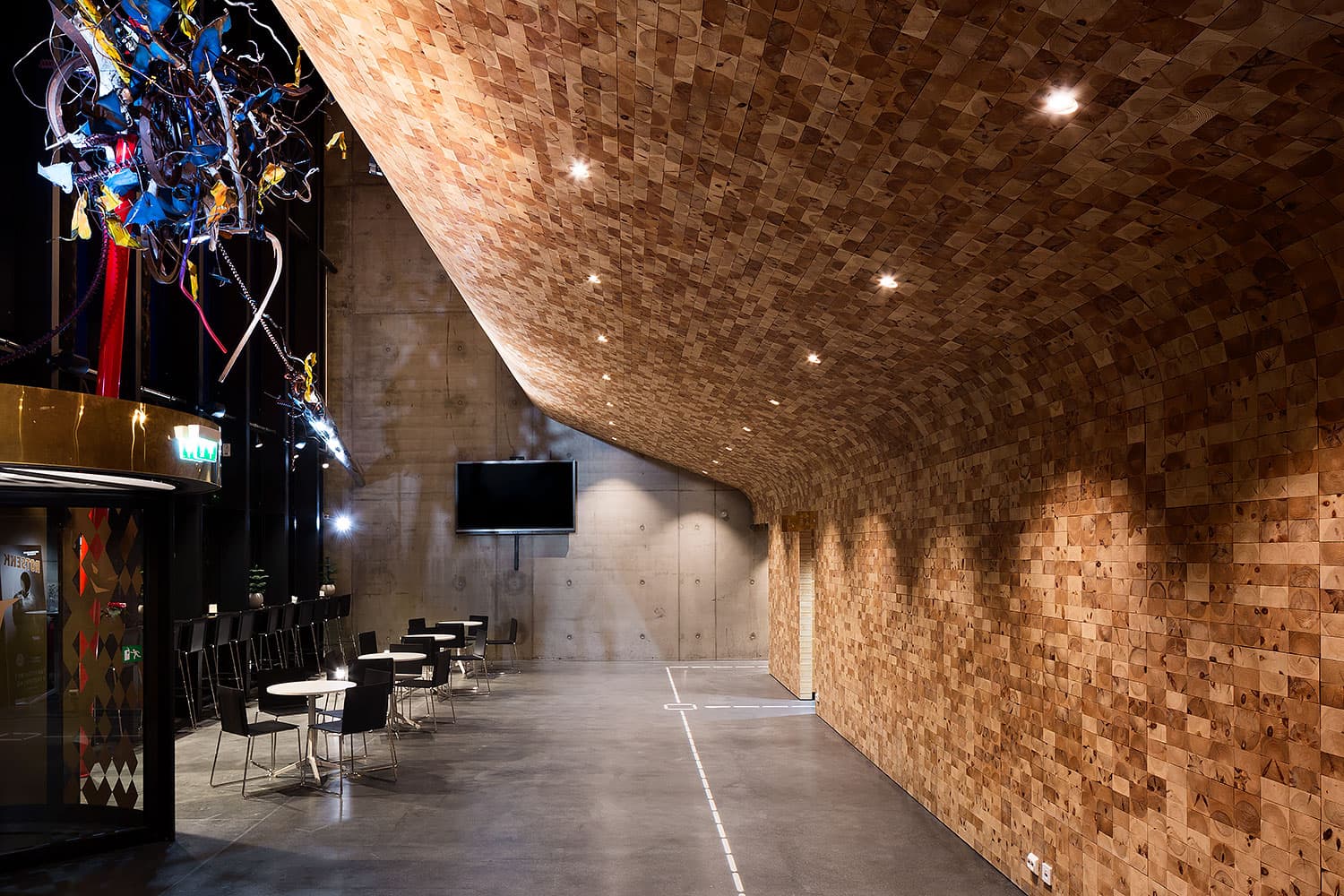 ”Bak ideen lå et sterkt ønske om å benytte tre både utvendig og innvendig i bygget. Tre er vakkert, det er ikke spesielt dyrt, og det blir bare vakrere med tiden. Ideen med kubbeveggen var å skape en følelse av et snitt gjennom en kjempestor stabel med trelast, og at innganger til teatersalen og til toalettene var skåret ut i denne stabelen, dvs skape en slags massivitet og styrke. Tre er også et varmt materiale, som gir en lun atmosfære i foajéen.”