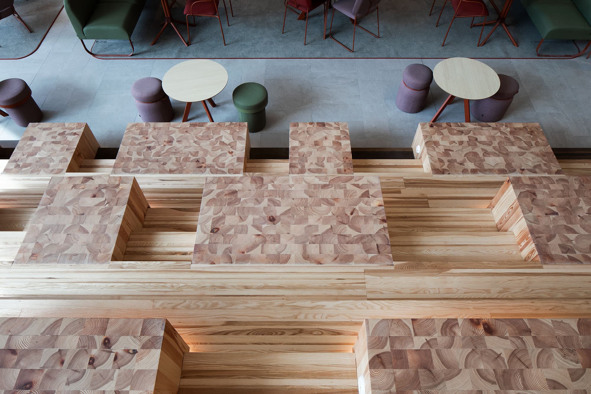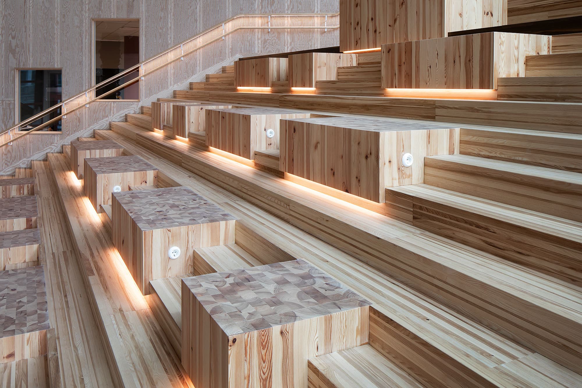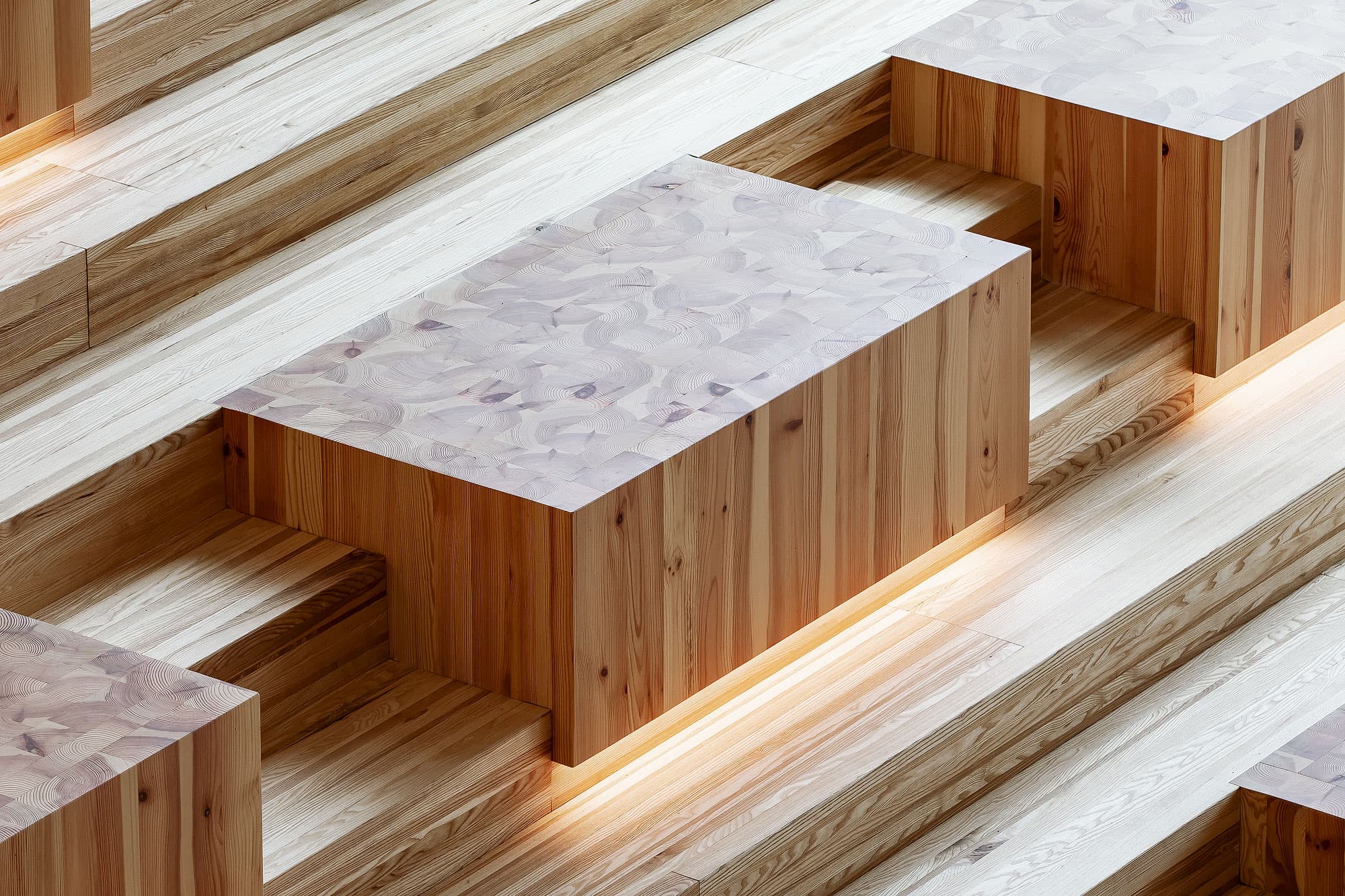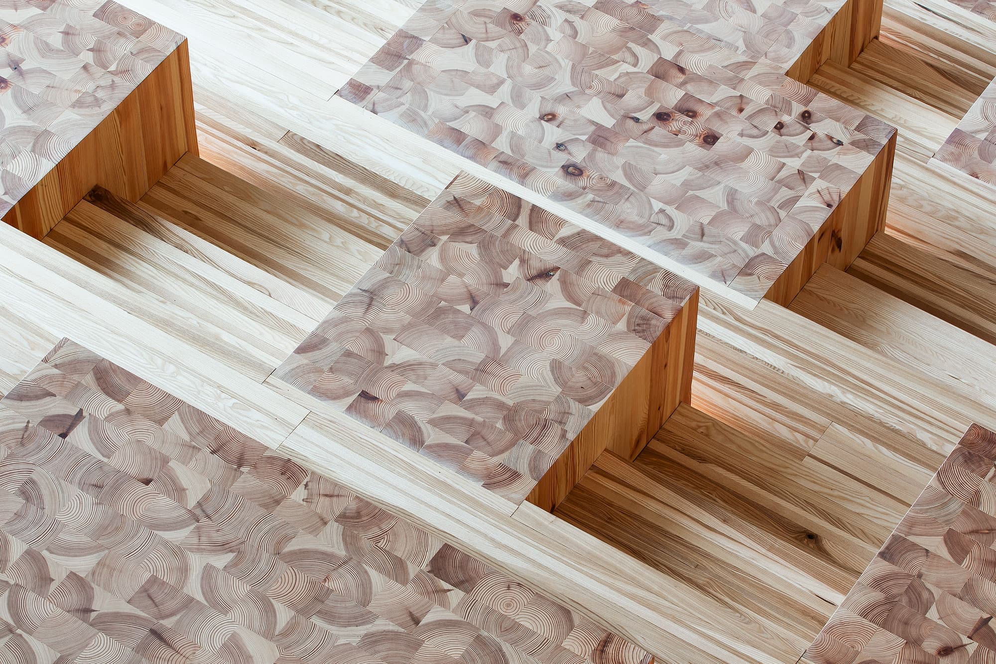 Utöver Design XL i ask innehåller trappan podier av Kubbgolv Base i furu.