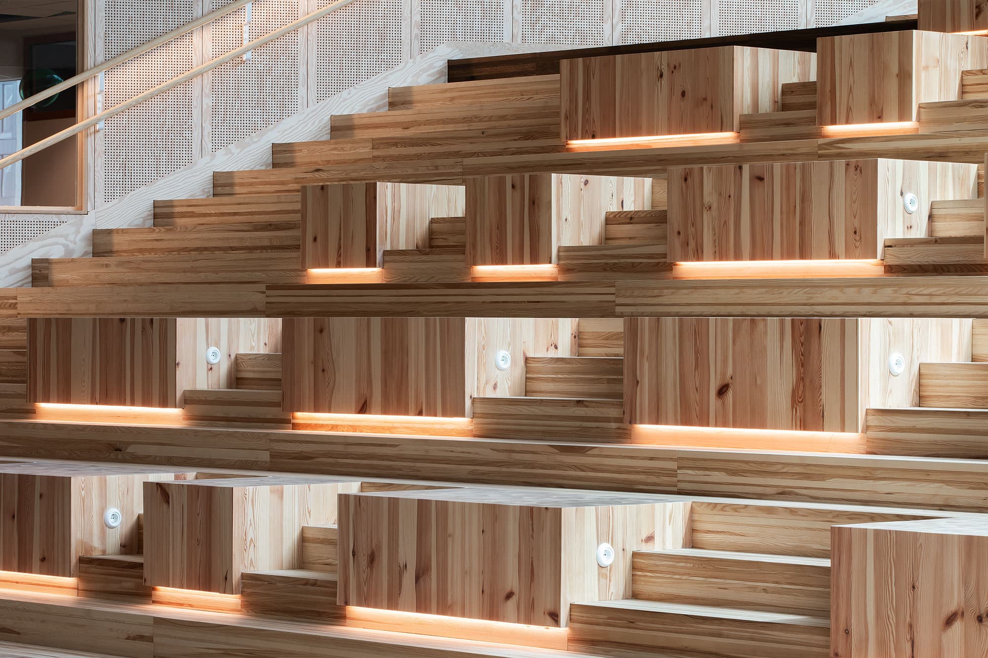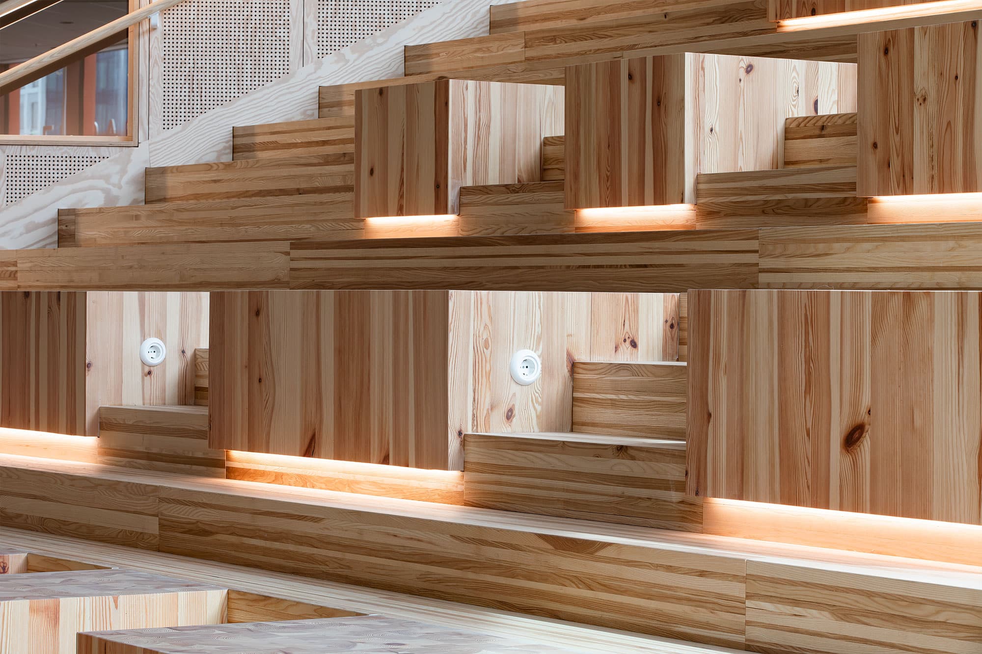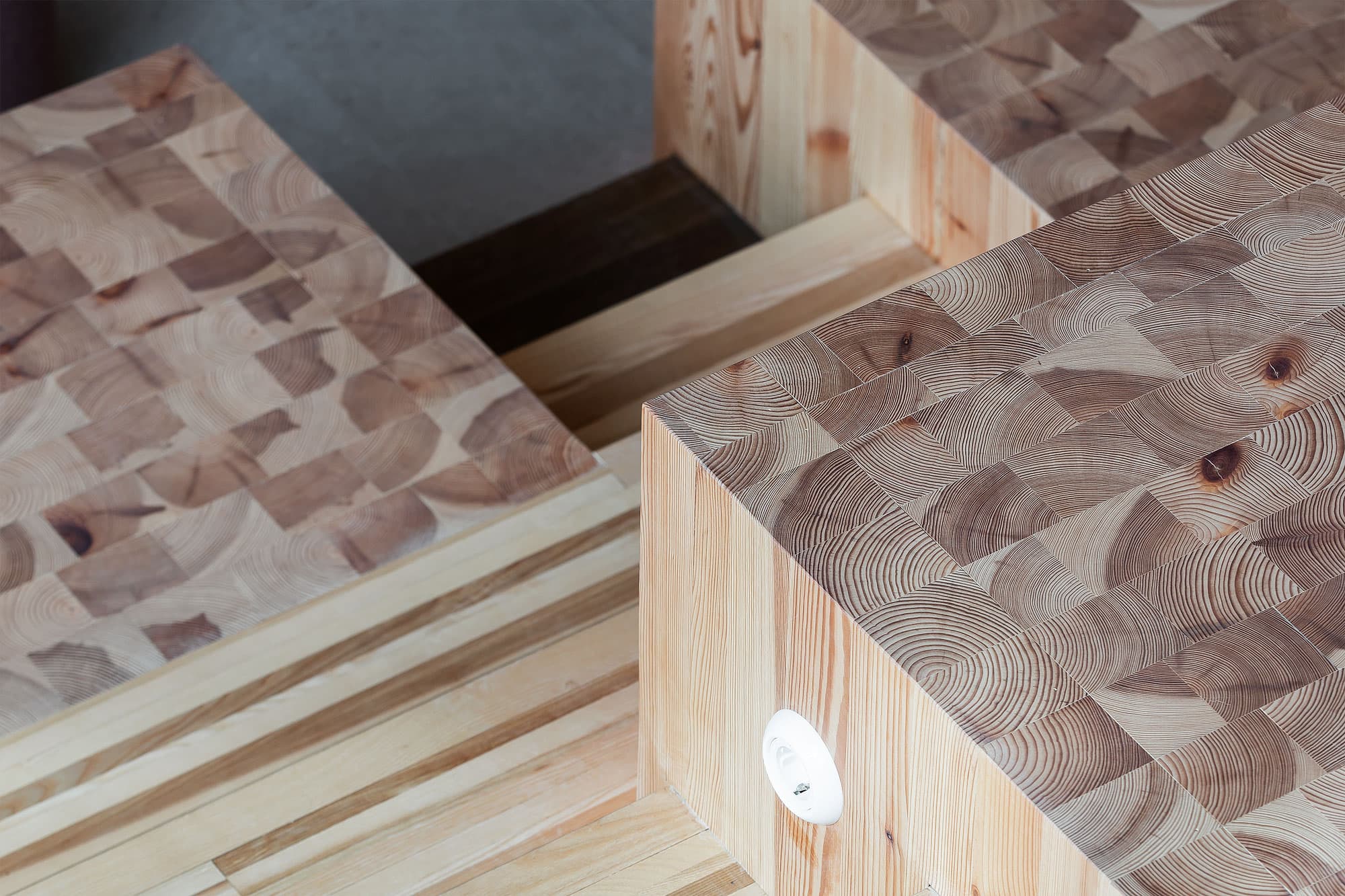 Utöver Design XL i ask innehåller trappan podier av Kubbgolv Base i furu.