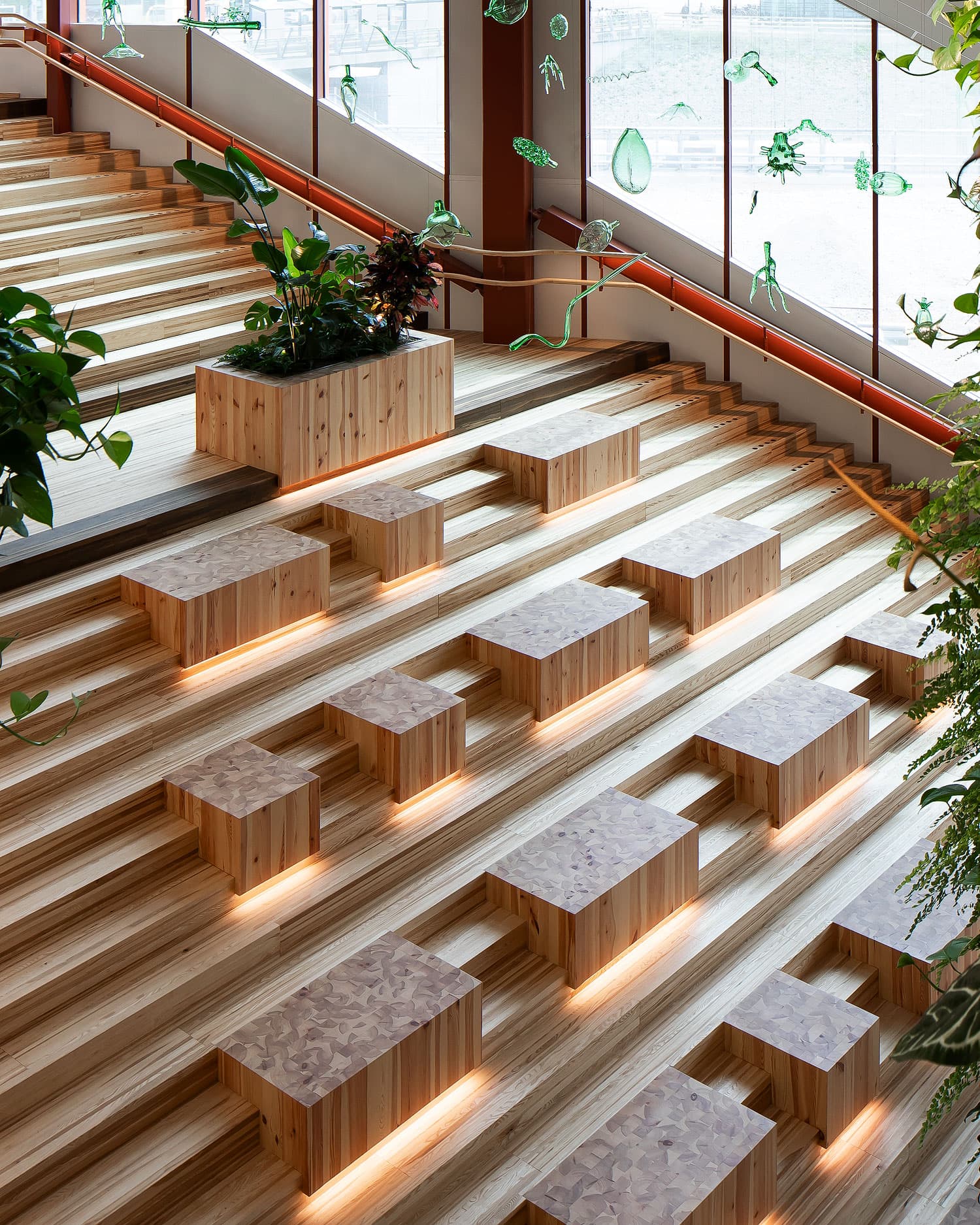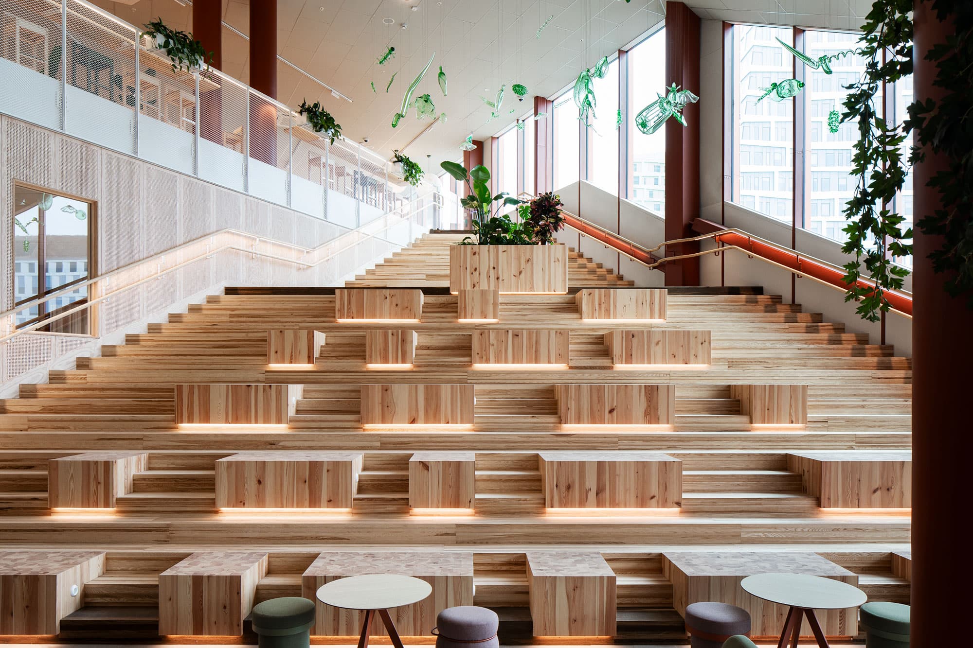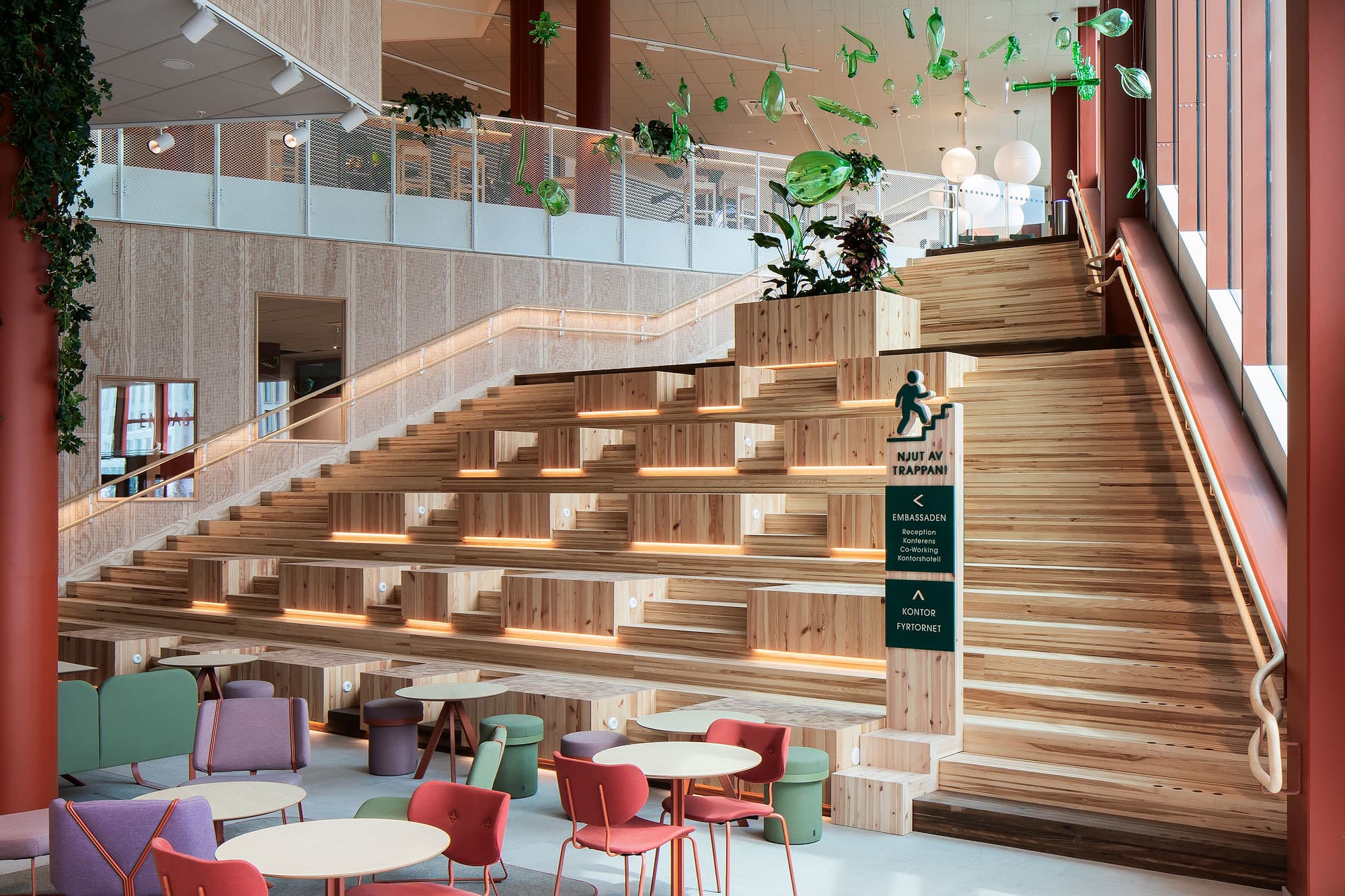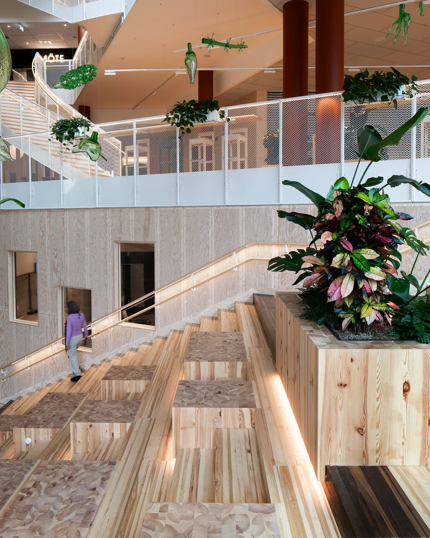Utöver Design XL i ask innehåller trappan podier av Kubbgolv Base i furu.