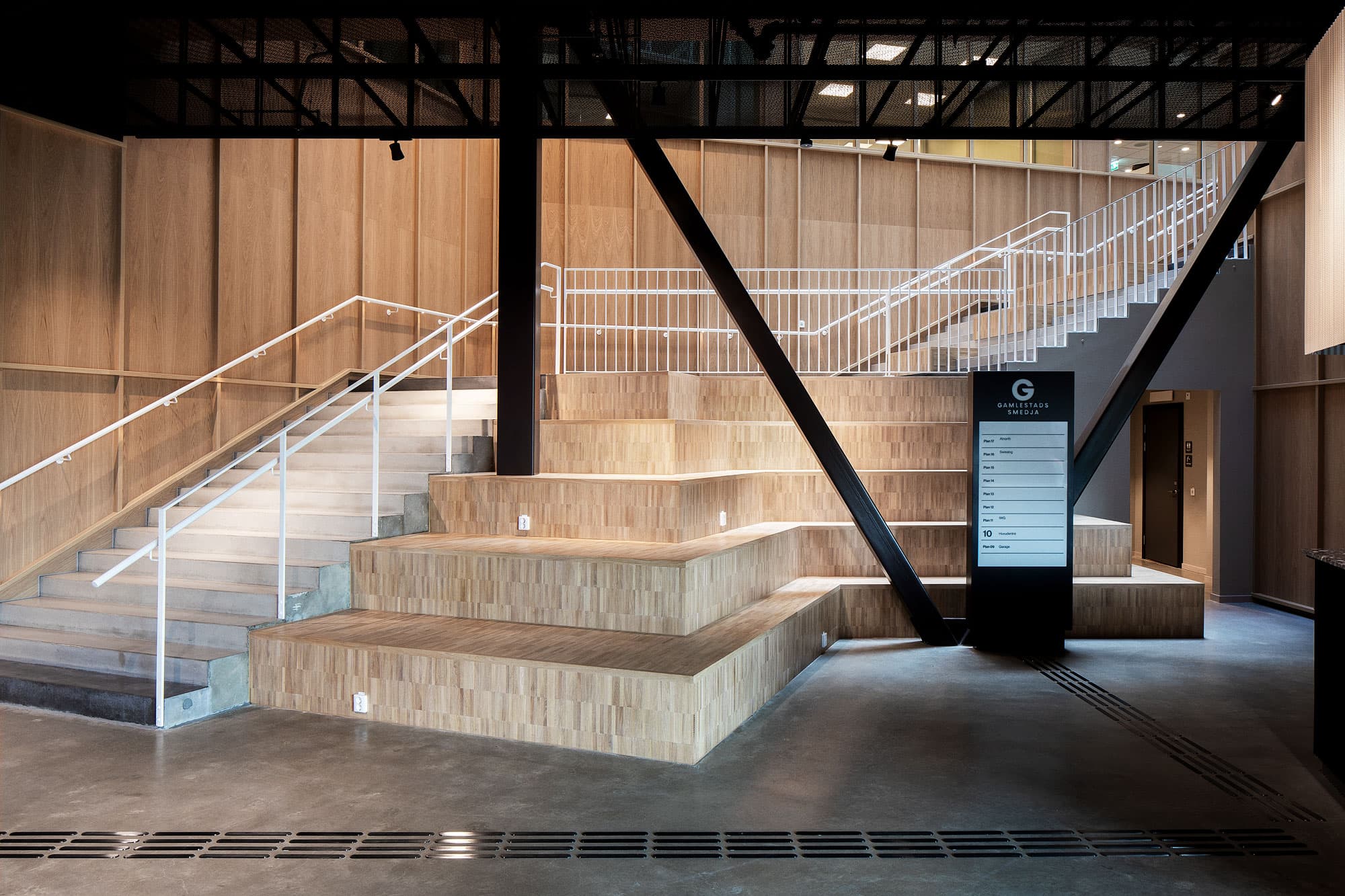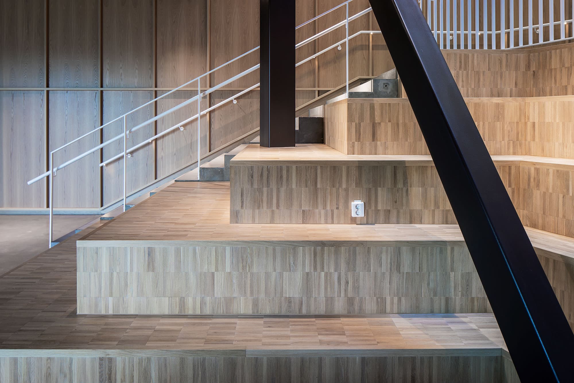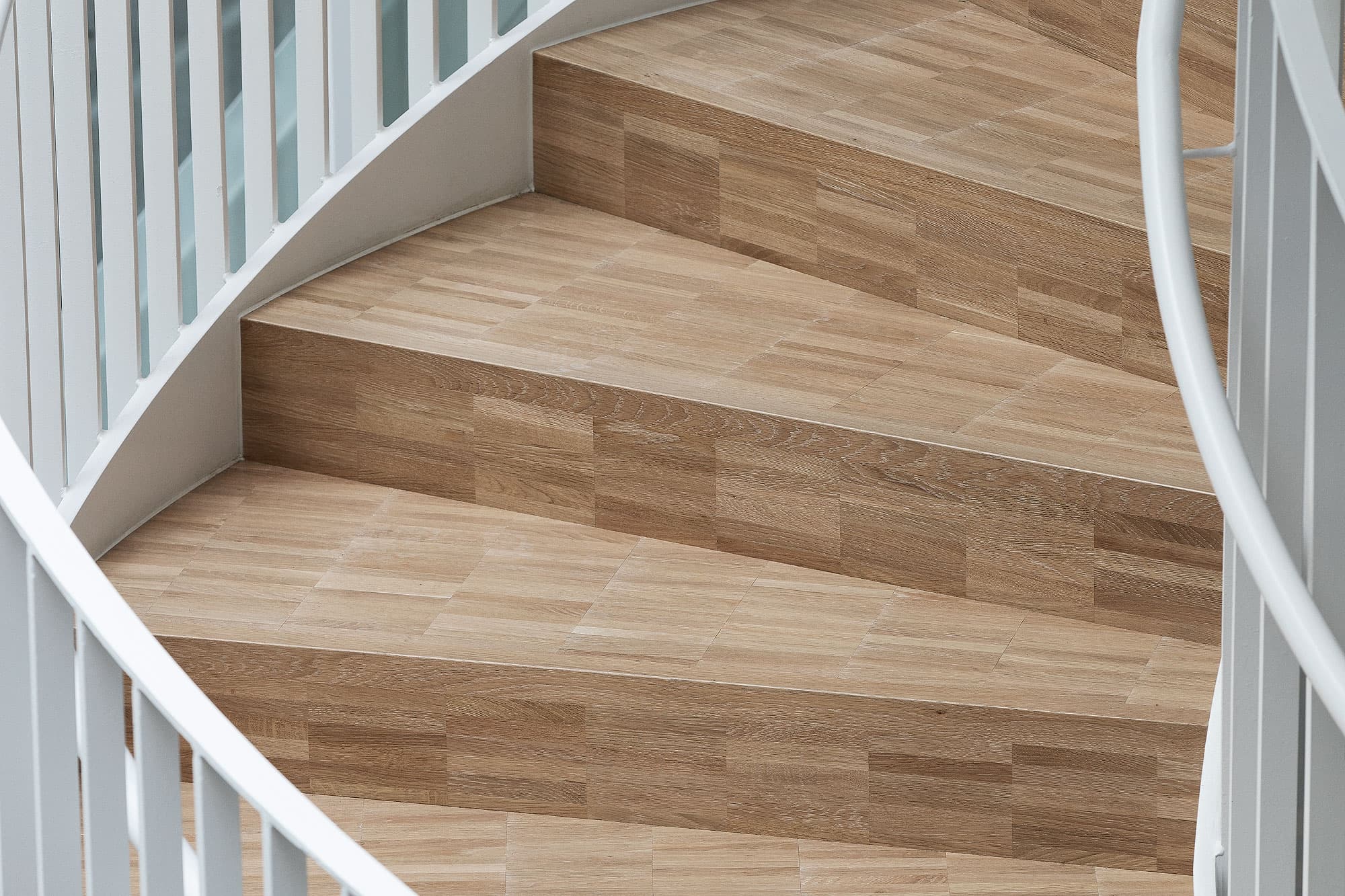Materialet till gradängen och spiraltrappan levereras precis som golvet slipat och ytbehandlat från produktion. Det enda som återstår på plats är en installationspolering. Fabriksfärdiga trappdelar effektiviserar hela byggprocessen då bygget inte behöver stanna av för slipning och ytbehandling.