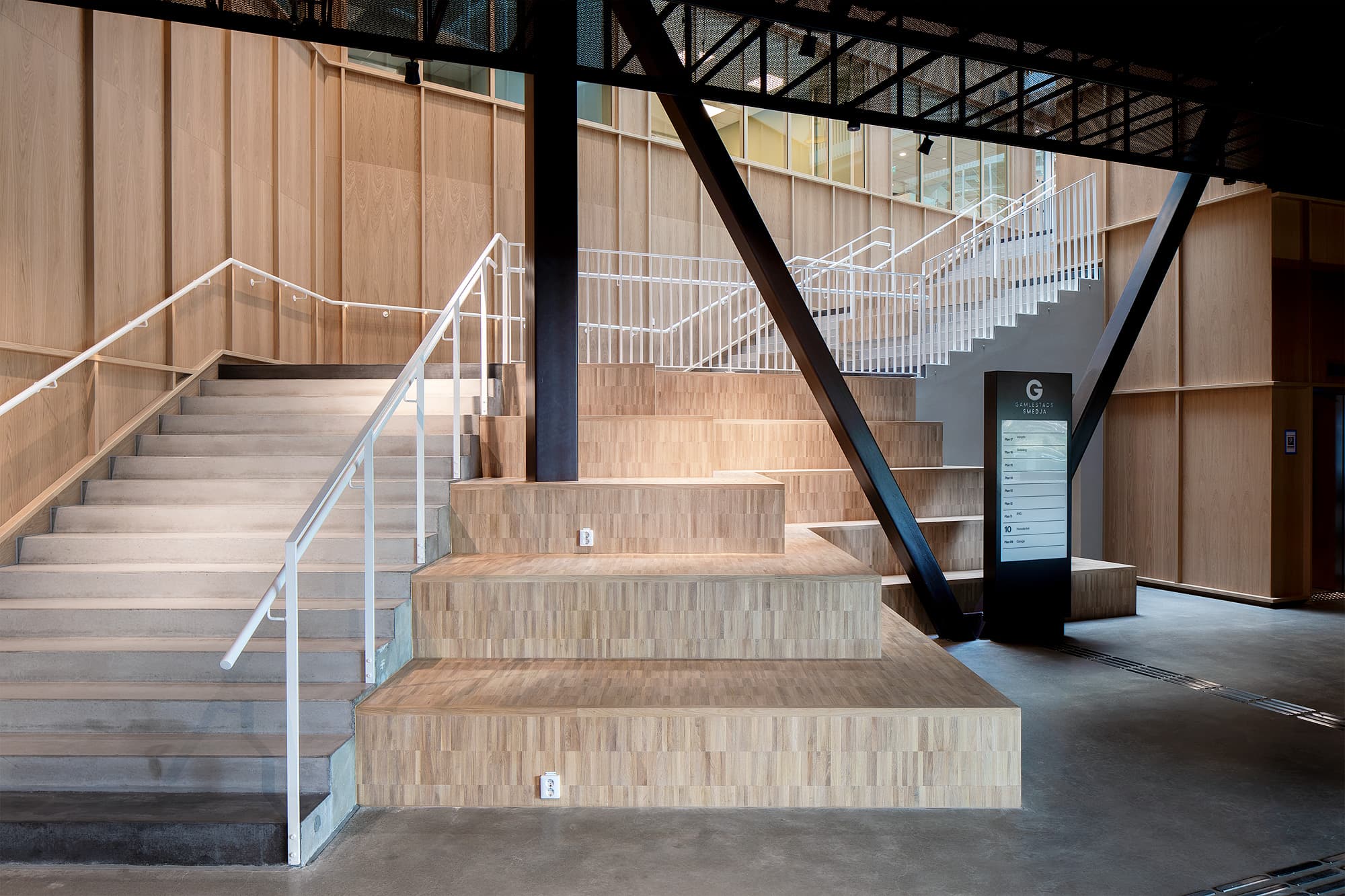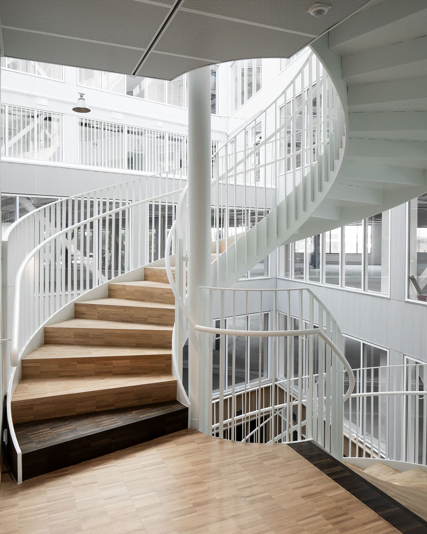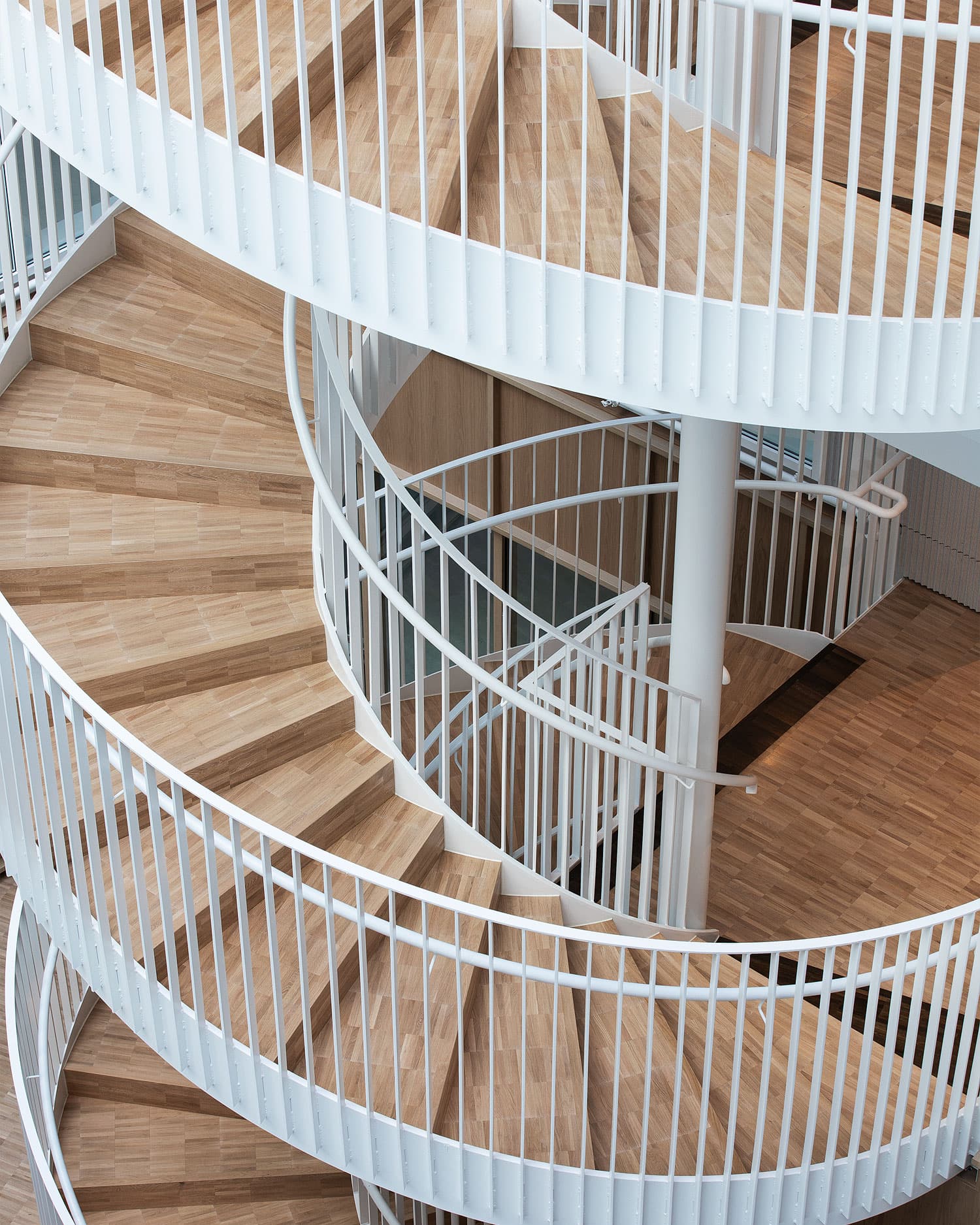 Materialet till gradängen och spiraltrappan levereras precis som golvet slipat och ytbehandlat från produktion. Det enda som återstår på plats är en installationspolering. Fabriksfärdiga trappdelar effektiviserar hela byggprocessen då bygget inte behöver stanna av för slipning och ytbehandling.