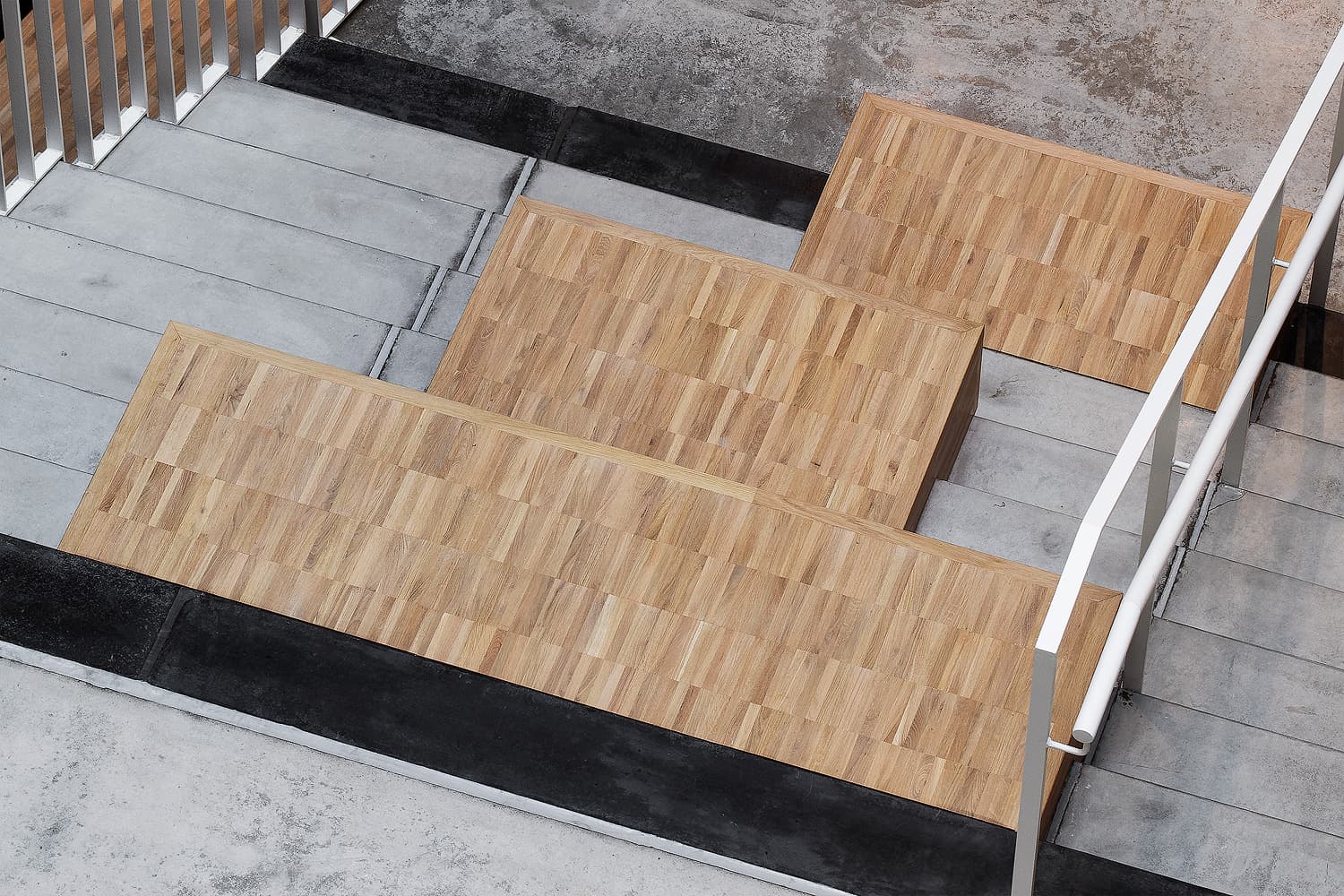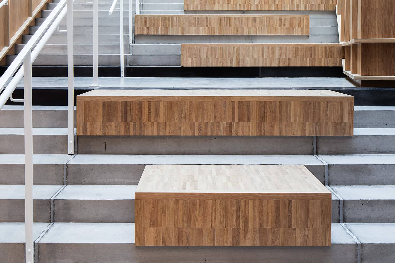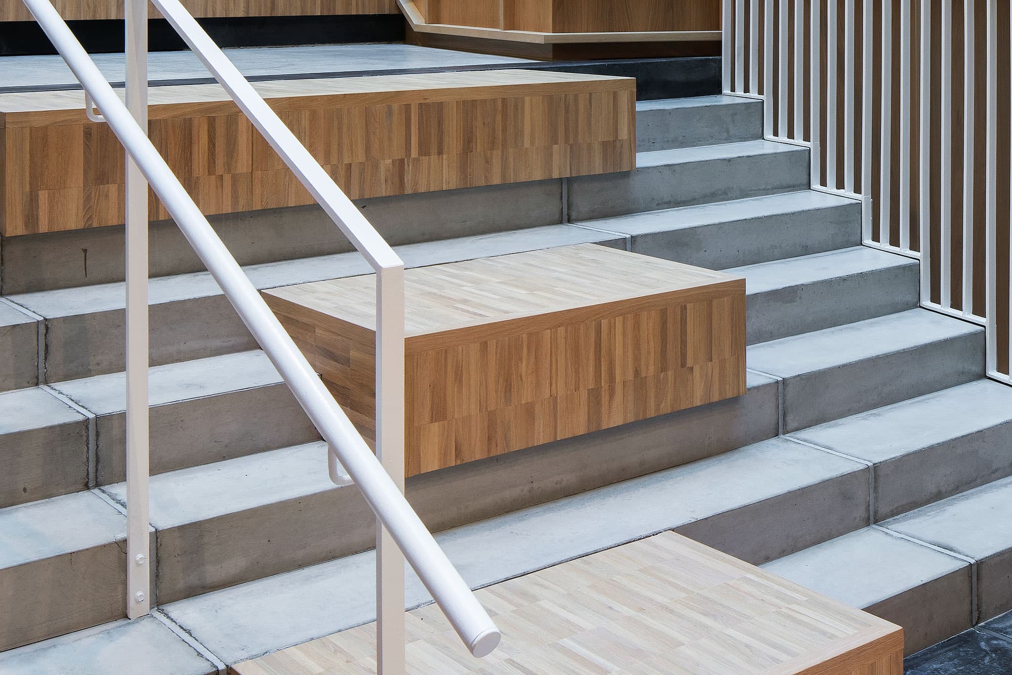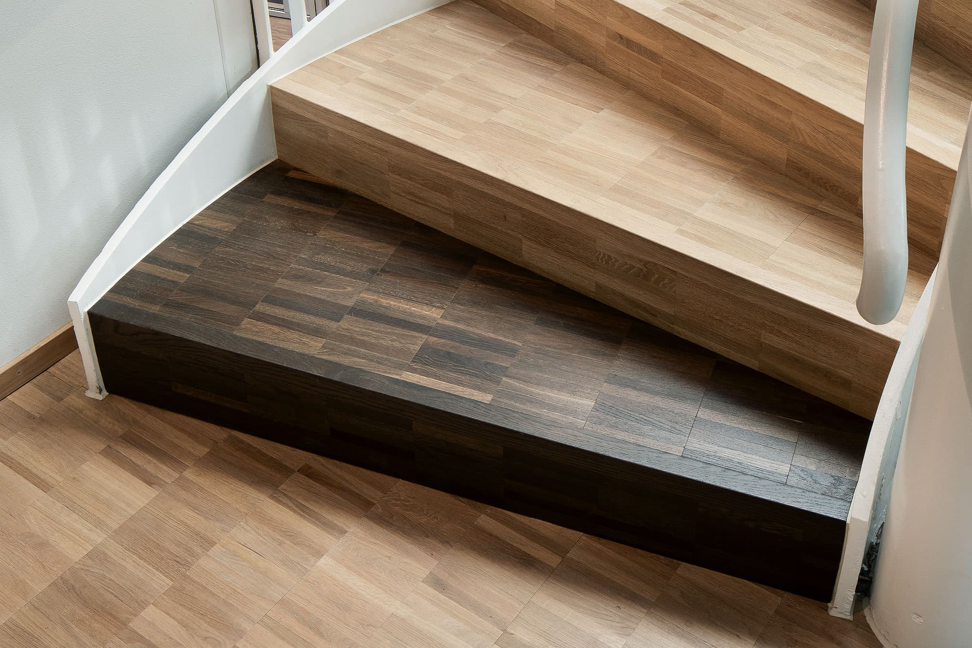 Kontrastmarkeringar kan göras på flera olika sätt. Här har man valt ett helt steg i Rökt Ek som kontrast. Man kan även välja att endast ha trappnosen i kontrasterande kulör, till exempel. Vi hjälper dig med att hitta en bra lösning som följer rådande regelverk avseende storlek och kontrast.