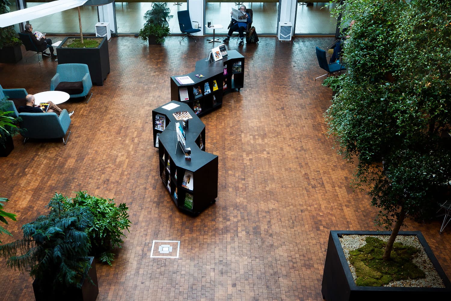 På Bibliotek Signalfabriken i Sundbyberg ligger sedan 2012 ett kubbgolv i rökt ek. Vi besökte biblioteket innan jul för uppföljning och samtal med gruppchef och lokalansvarige Lena Pettersson Ljunggren.